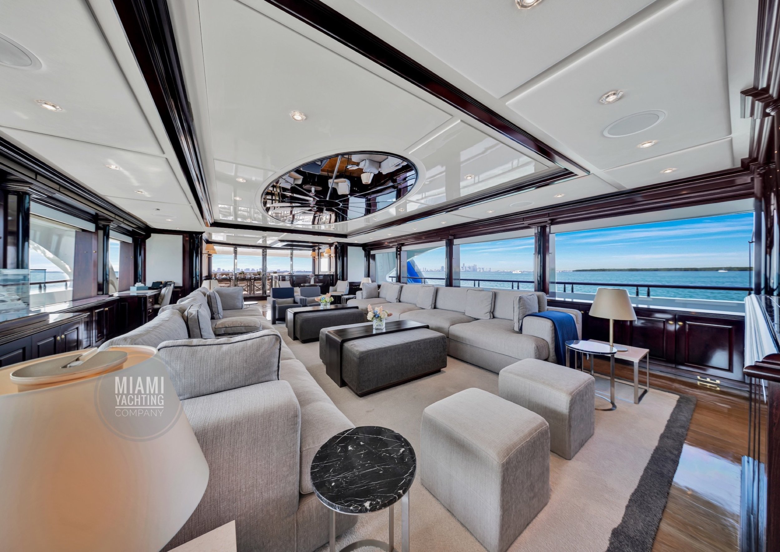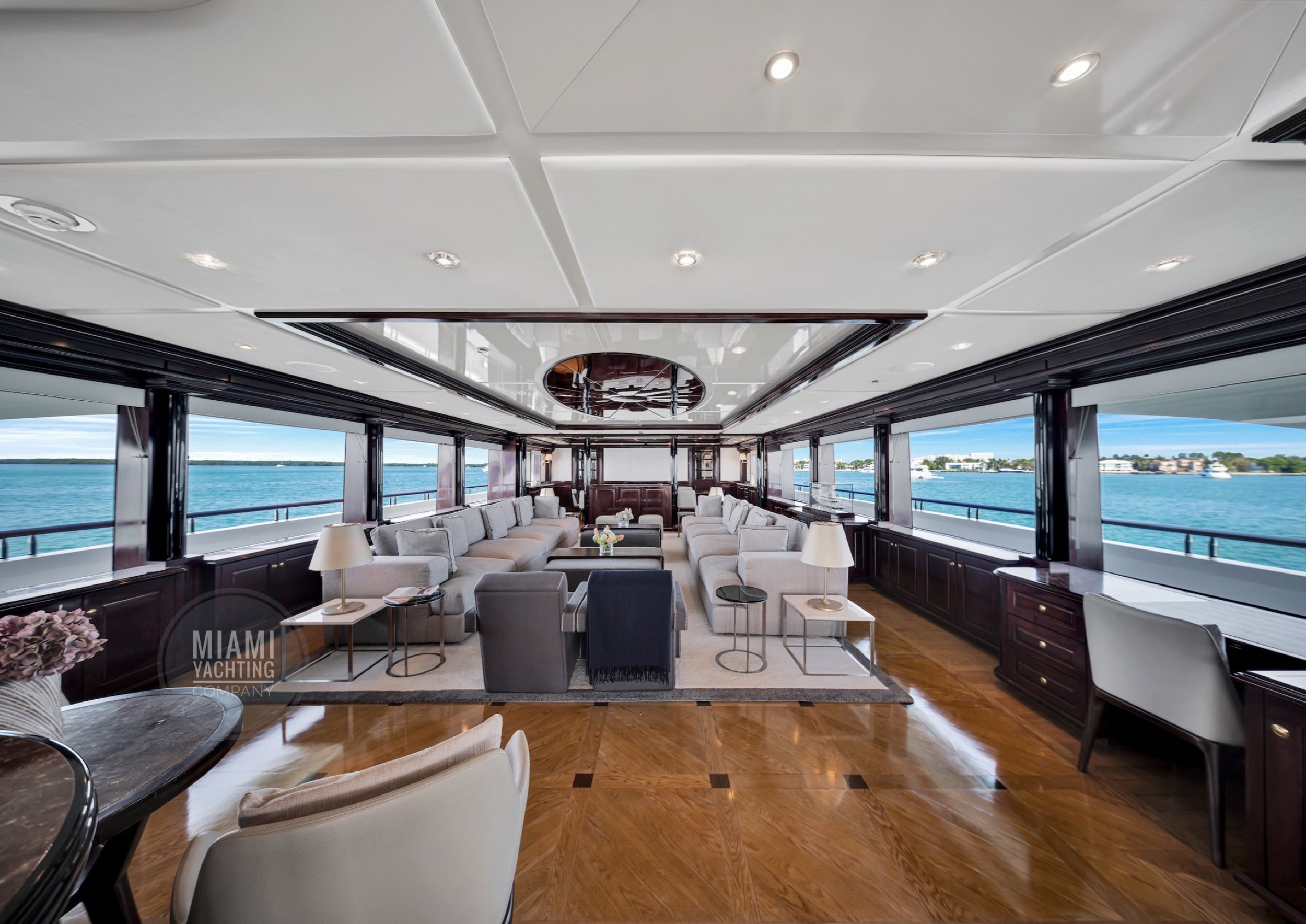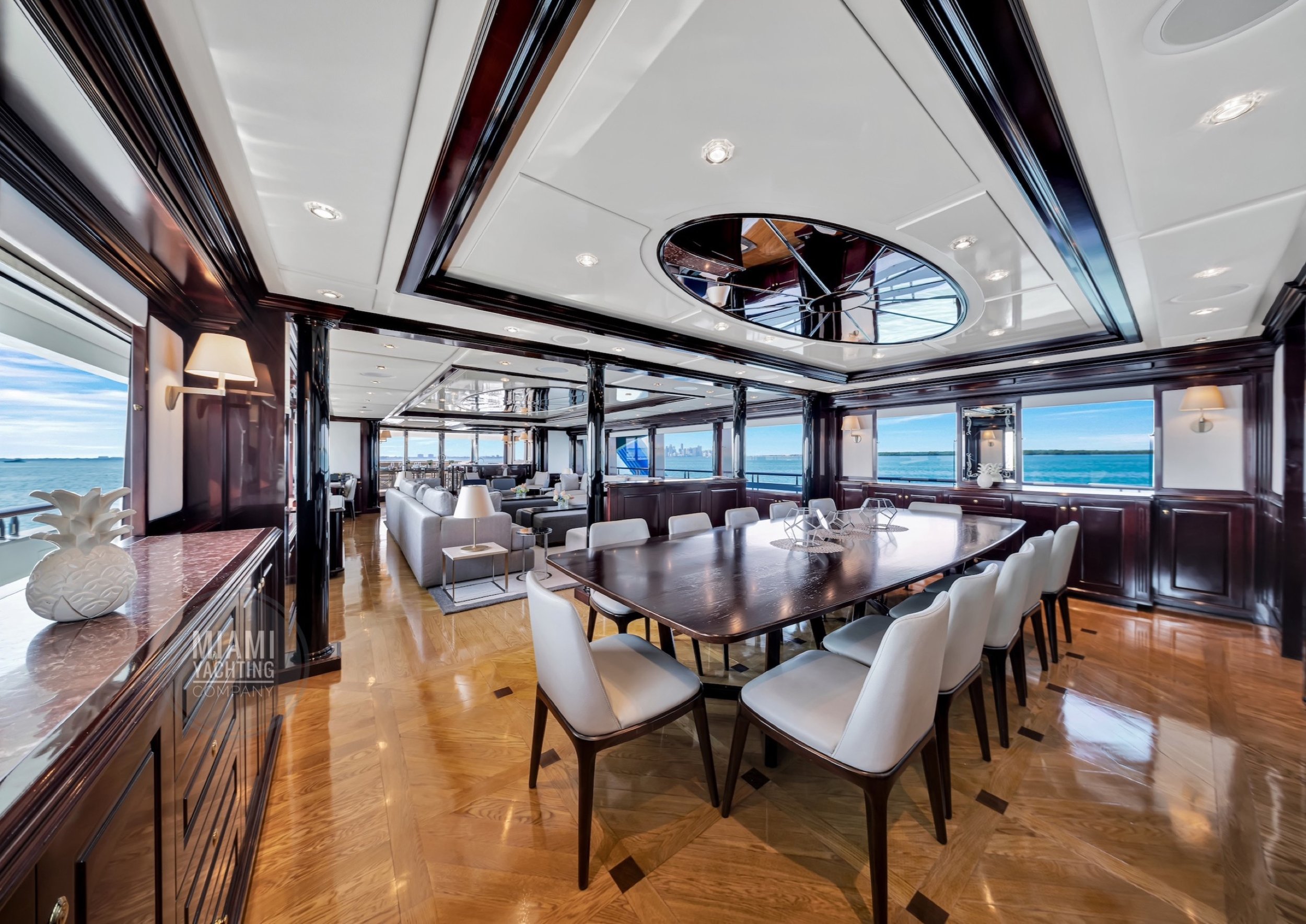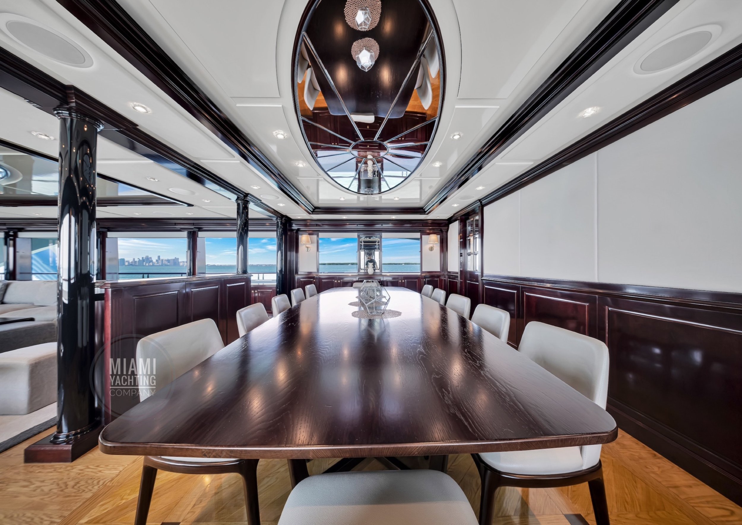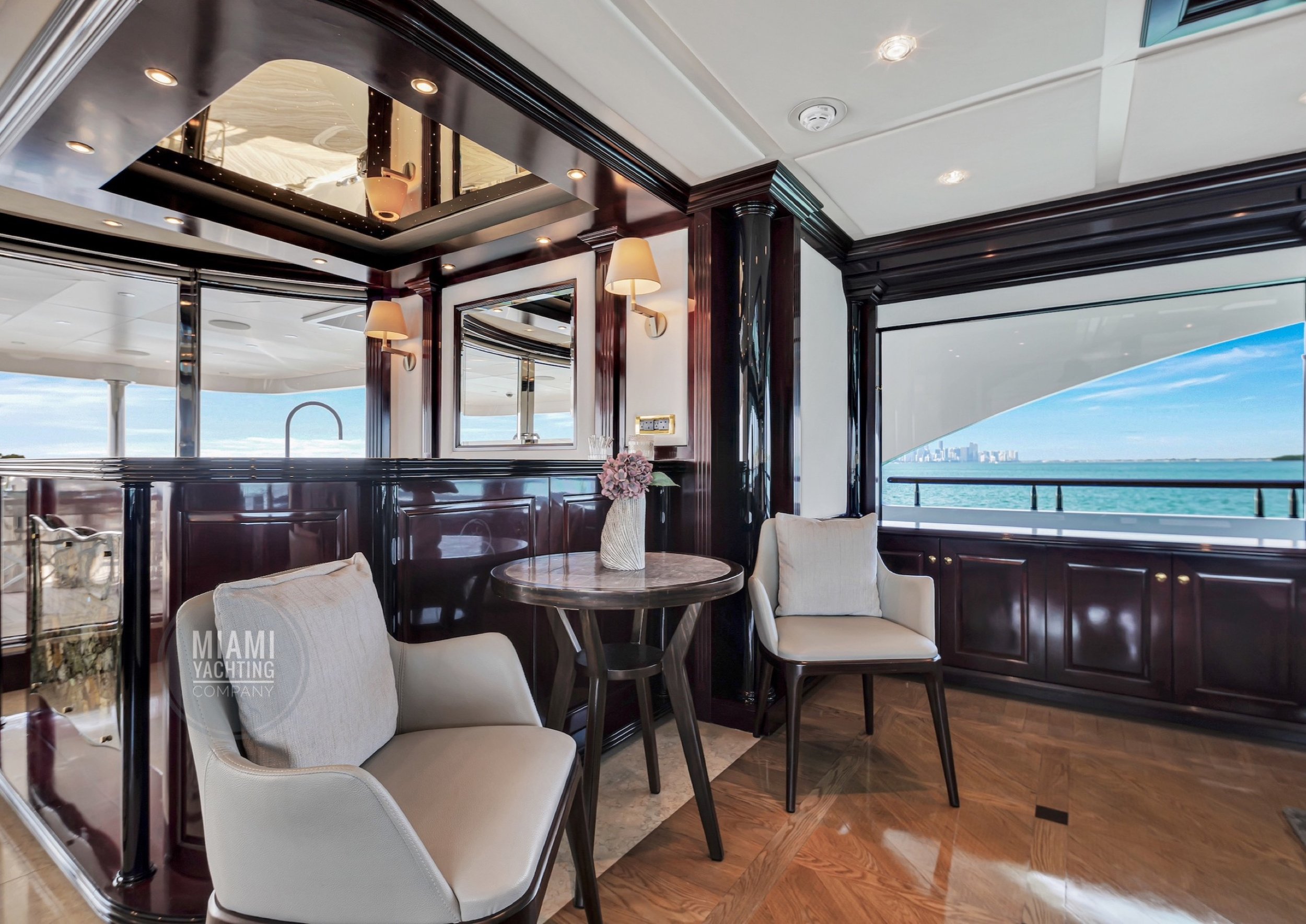 The interior is refined and contemporary, blending rich mahogany cabinetry with polished wood flooring and sleek black accents. The salon is bright and spacious with oversized windows, a formal dining area, and state-of-the-art entertainment systems. Every detail is crafted to provide an exceptional onboard experience that seamlessly combines style and relaxation for your Miami yacht charter.