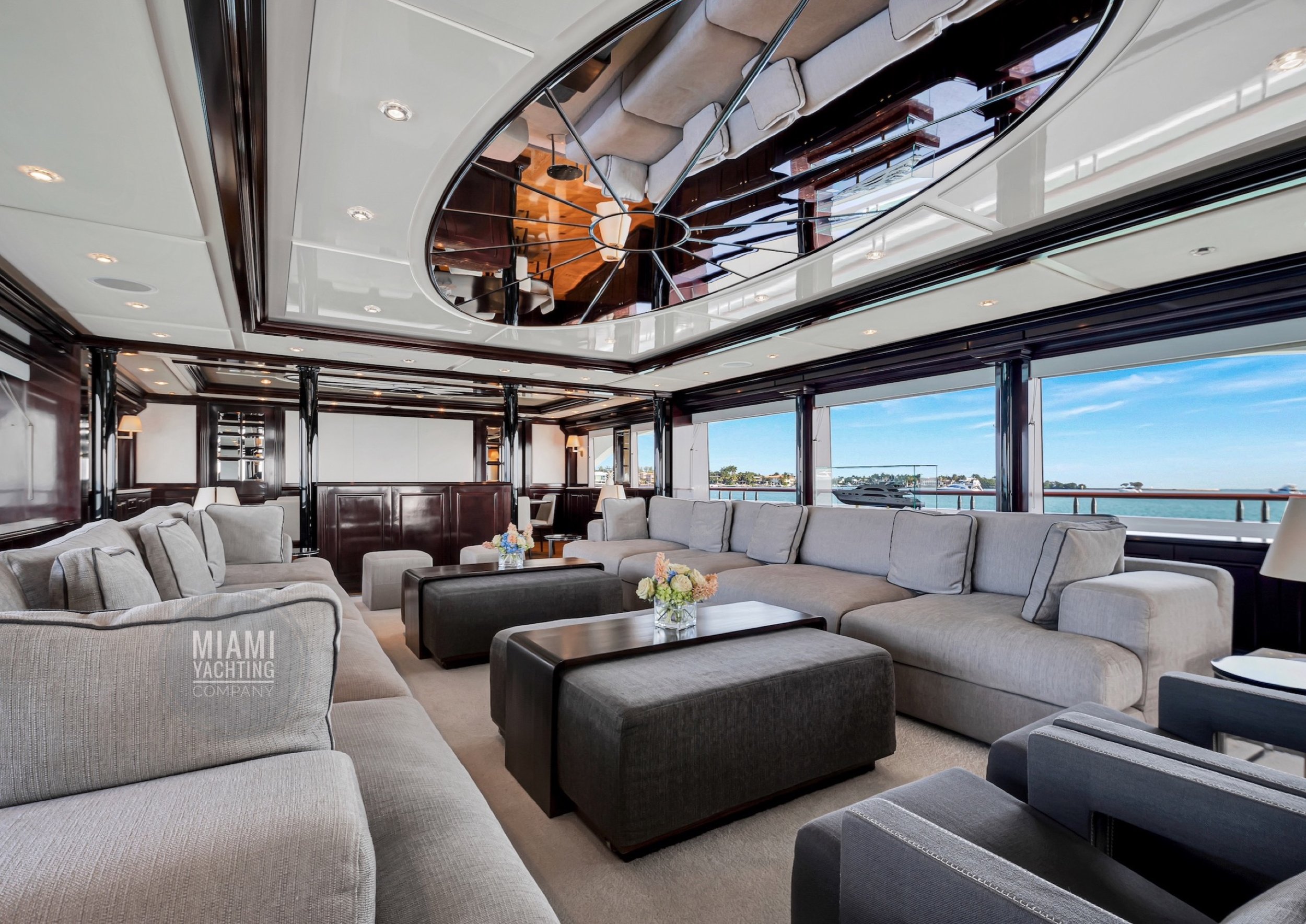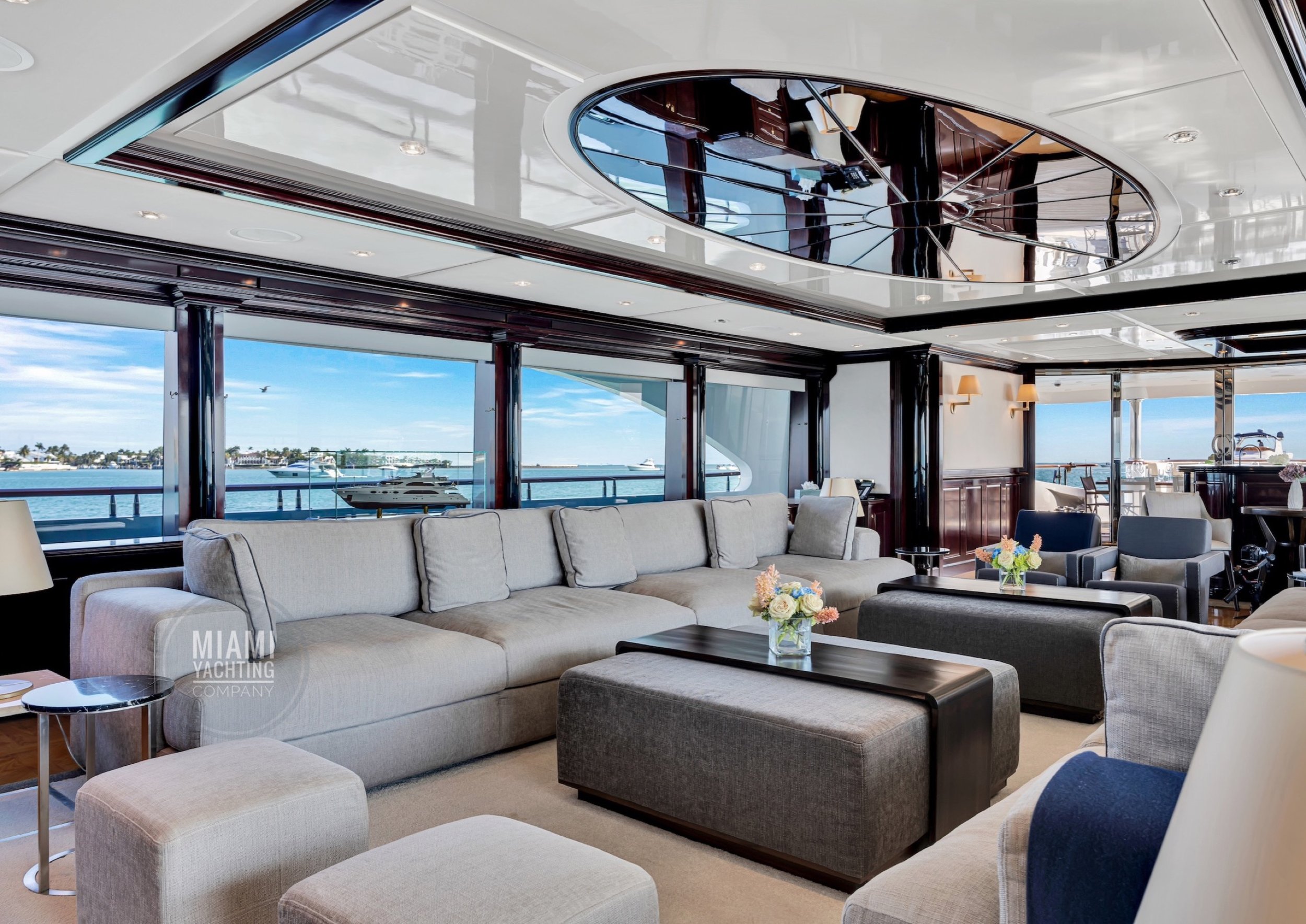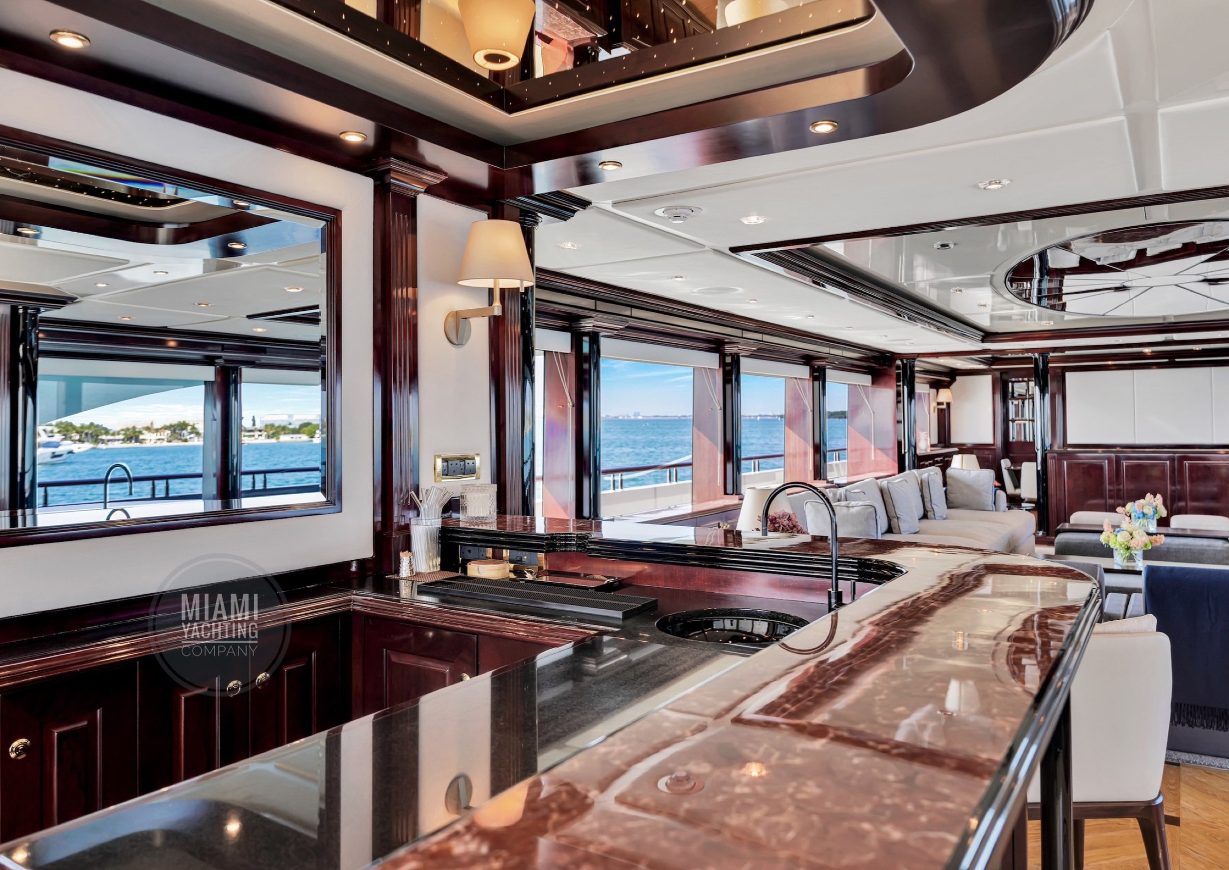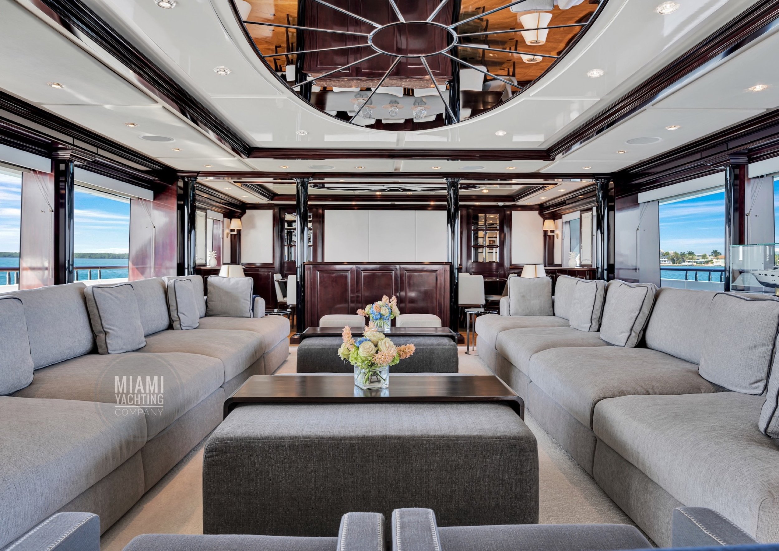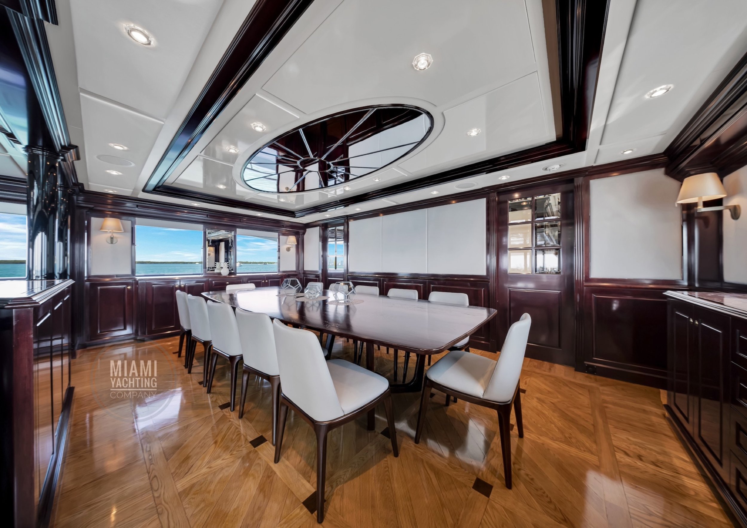 The interior is refined and contemporary, blending rich mahogany cabinetry with polished wood flooring and sleek black accents. The salon is bright and spacious with oversized windows, a formal dining area, and state-of-the-art entertainment systems. Every detail is crafted to provide an exceptional onboard experience that seamlessly combines style and relaxation for your Miami yacht charter.