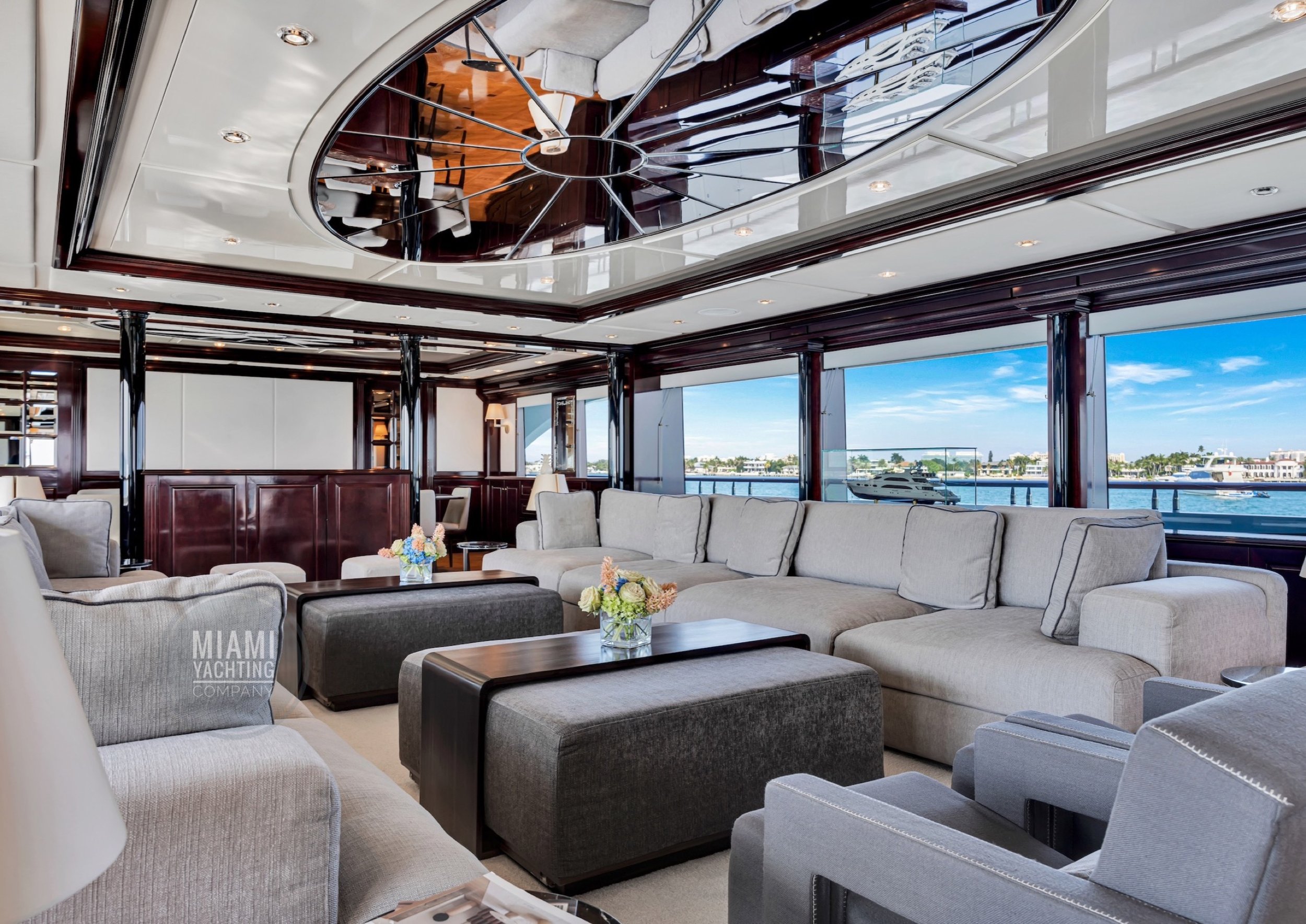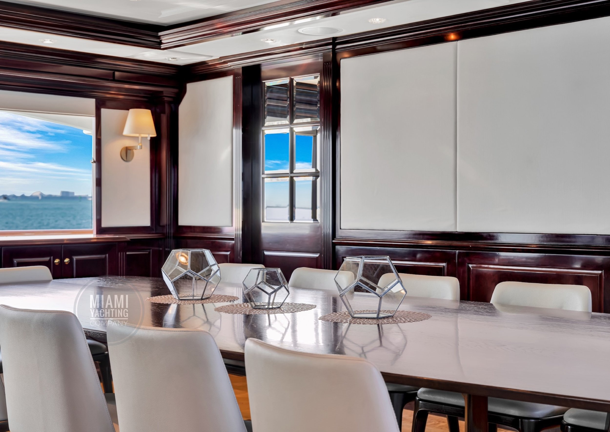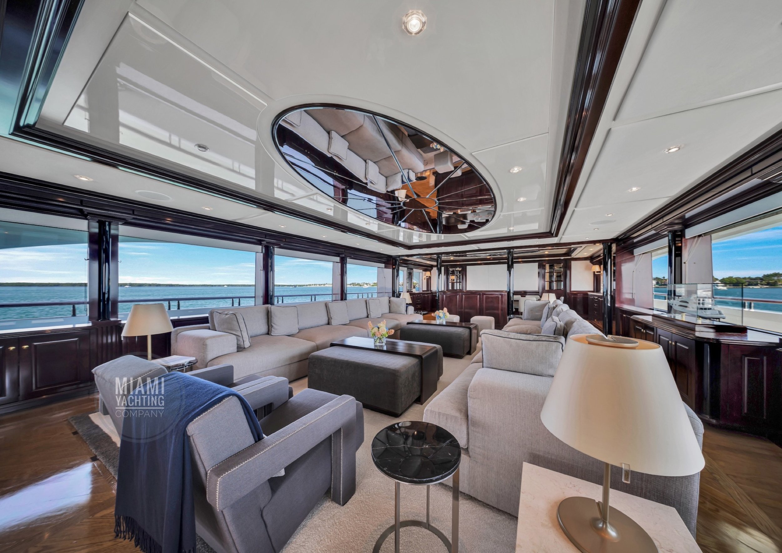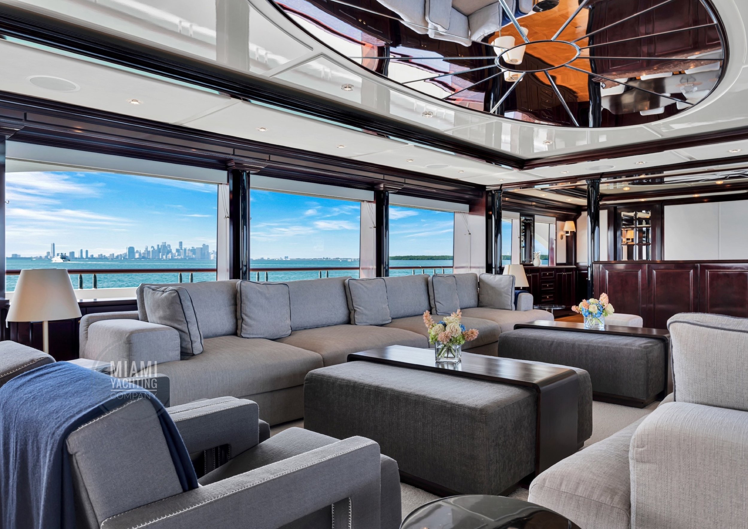 The interior is refined and contemporary, blending rich mahogany cabinetry with polished wood flooring and sleek black accents. The salon is bright and spacious with oversized windows, a formal dining area, and state-of-the-art entertainment systems. Every detail is crafted to provide an exceptional onboard experience that seamlessly combines style and relaxation for your Miami yacht charter.