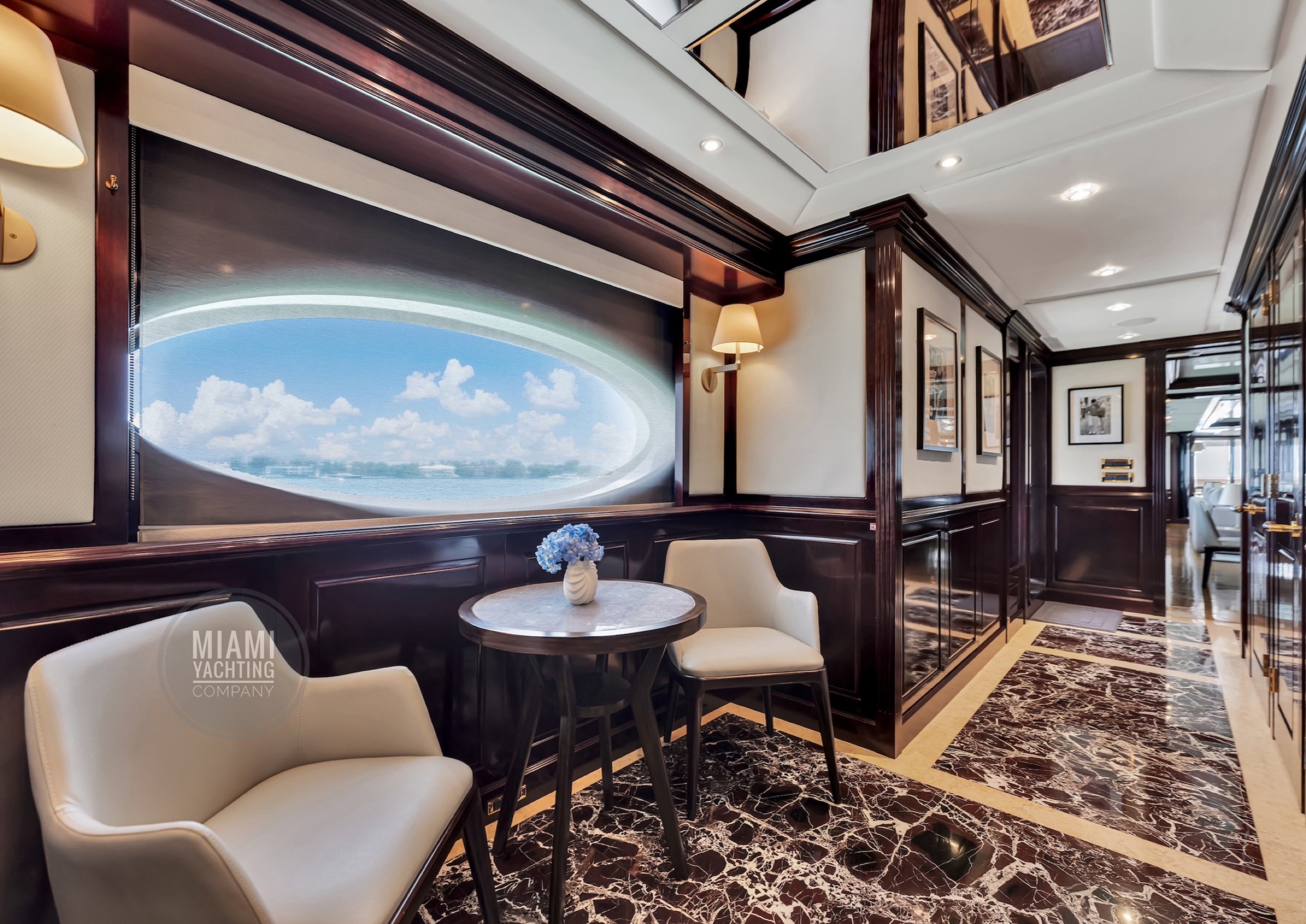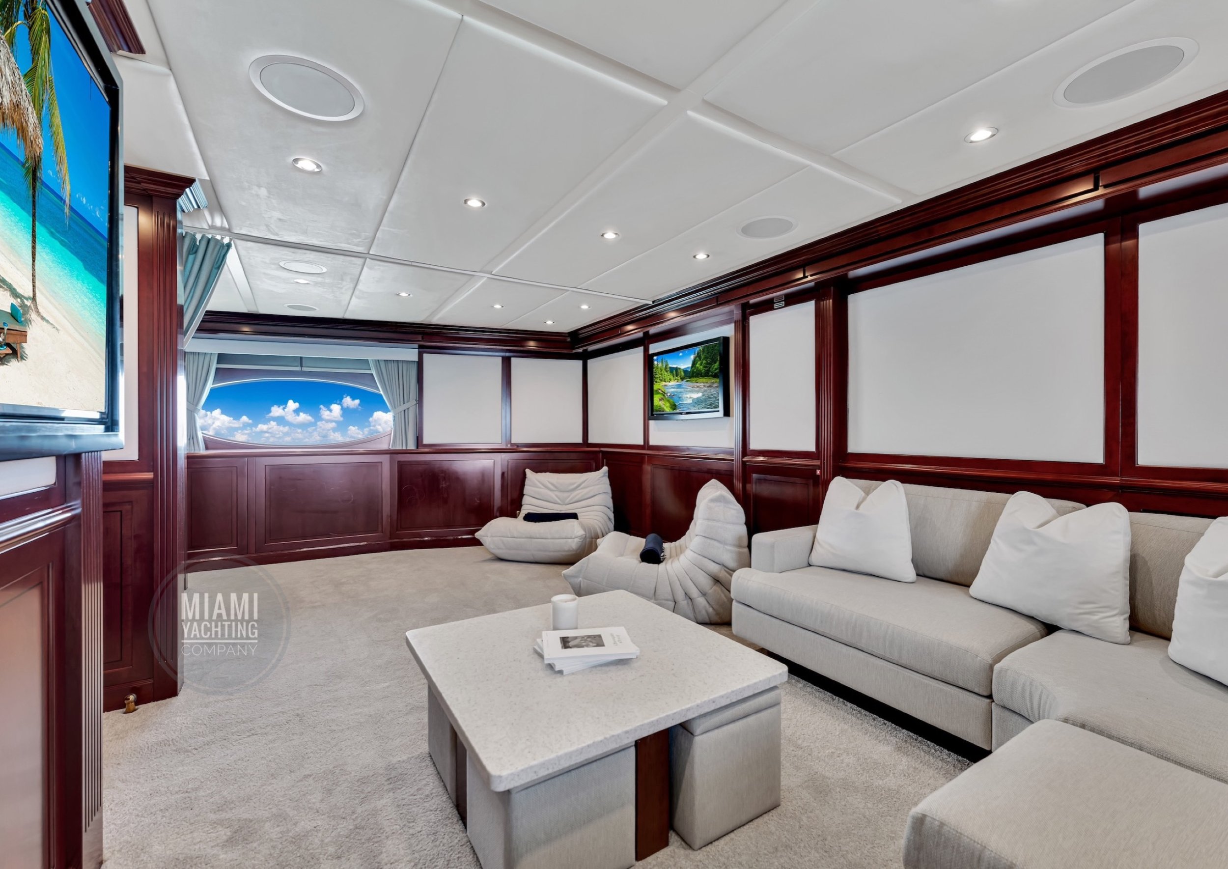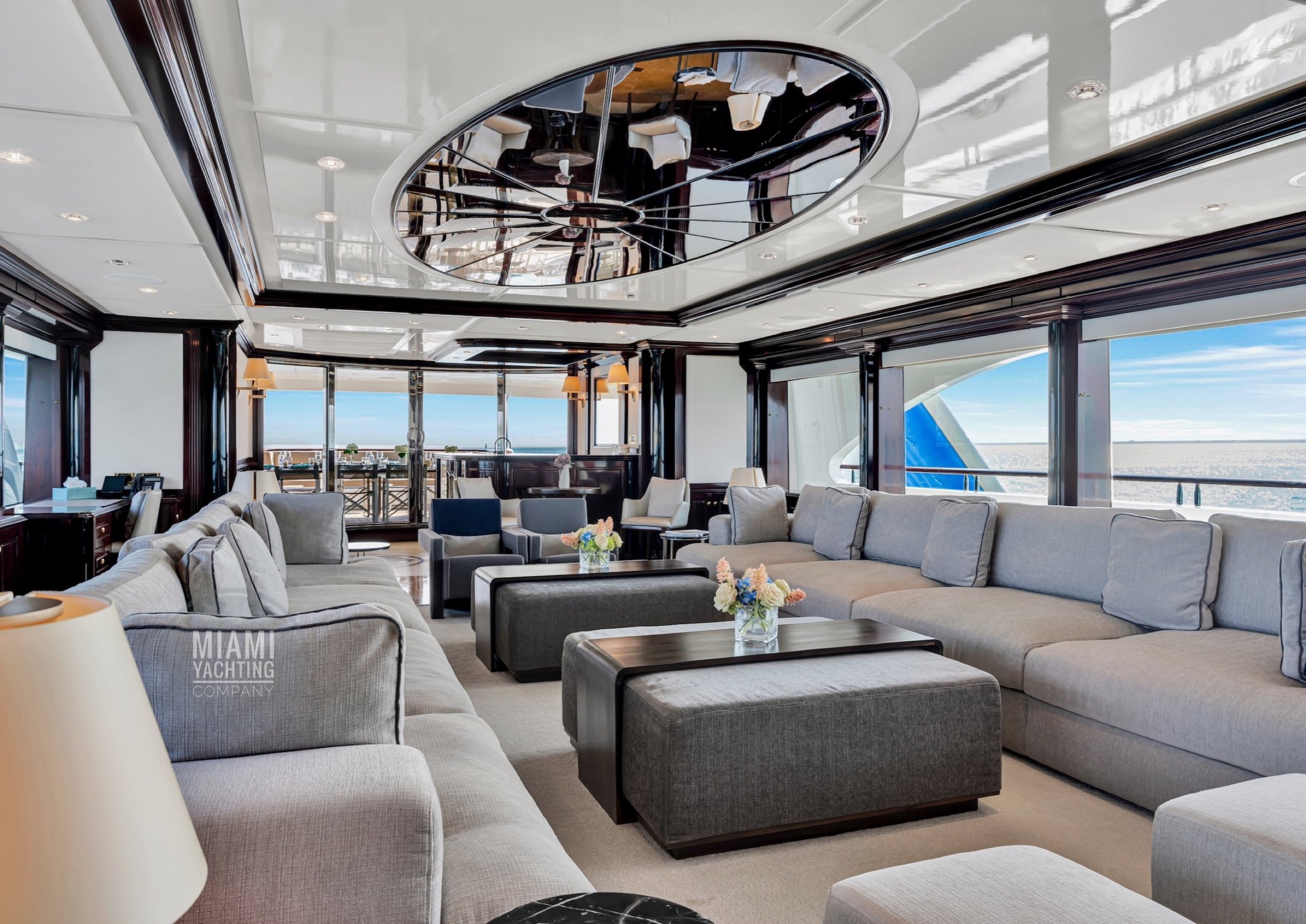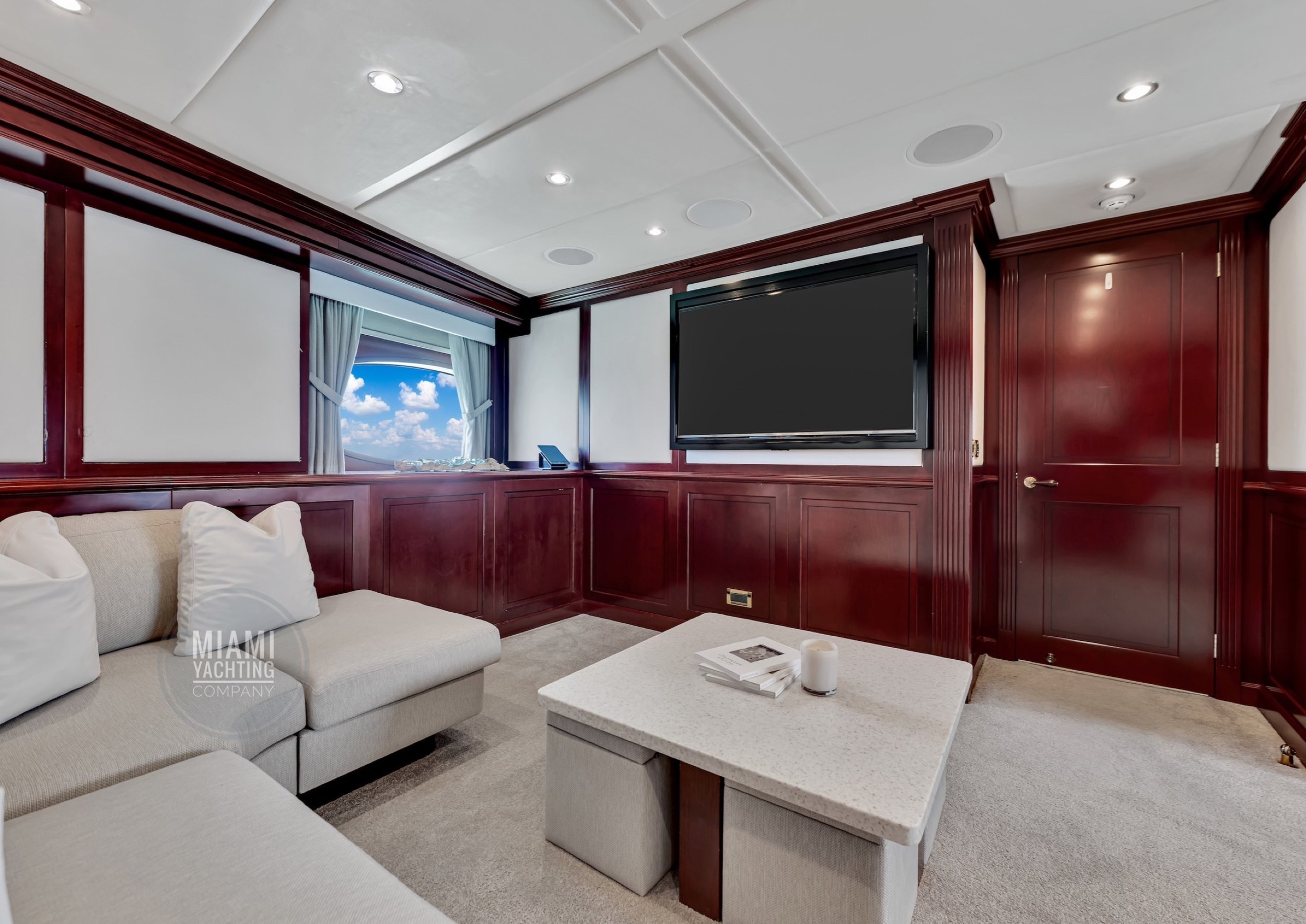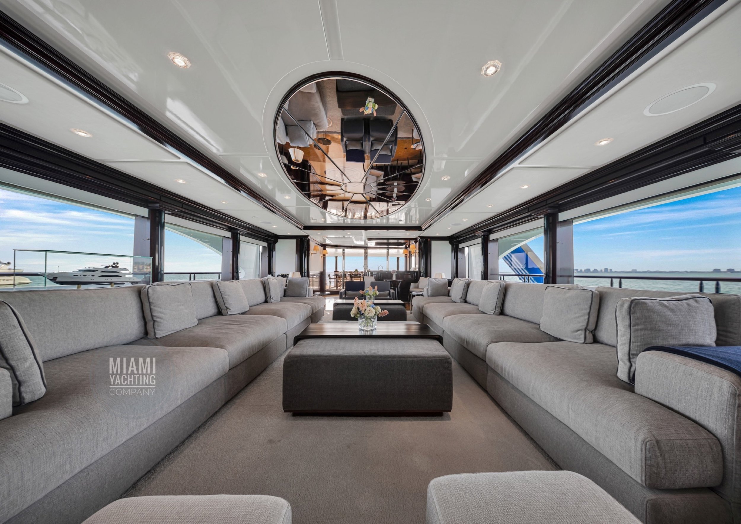 The interior is refined and contemporary, blending rich mahogany cabinetry with polished wood flooring and sleek black accents. The salon is bright and spacious with oversized windows, a formal dining area, and state-of-the-art entertainment systems. Every detail is crafted to provide an exceptional onboard experience that seamlessly combines style and relaxation for your Miami yacht charter.