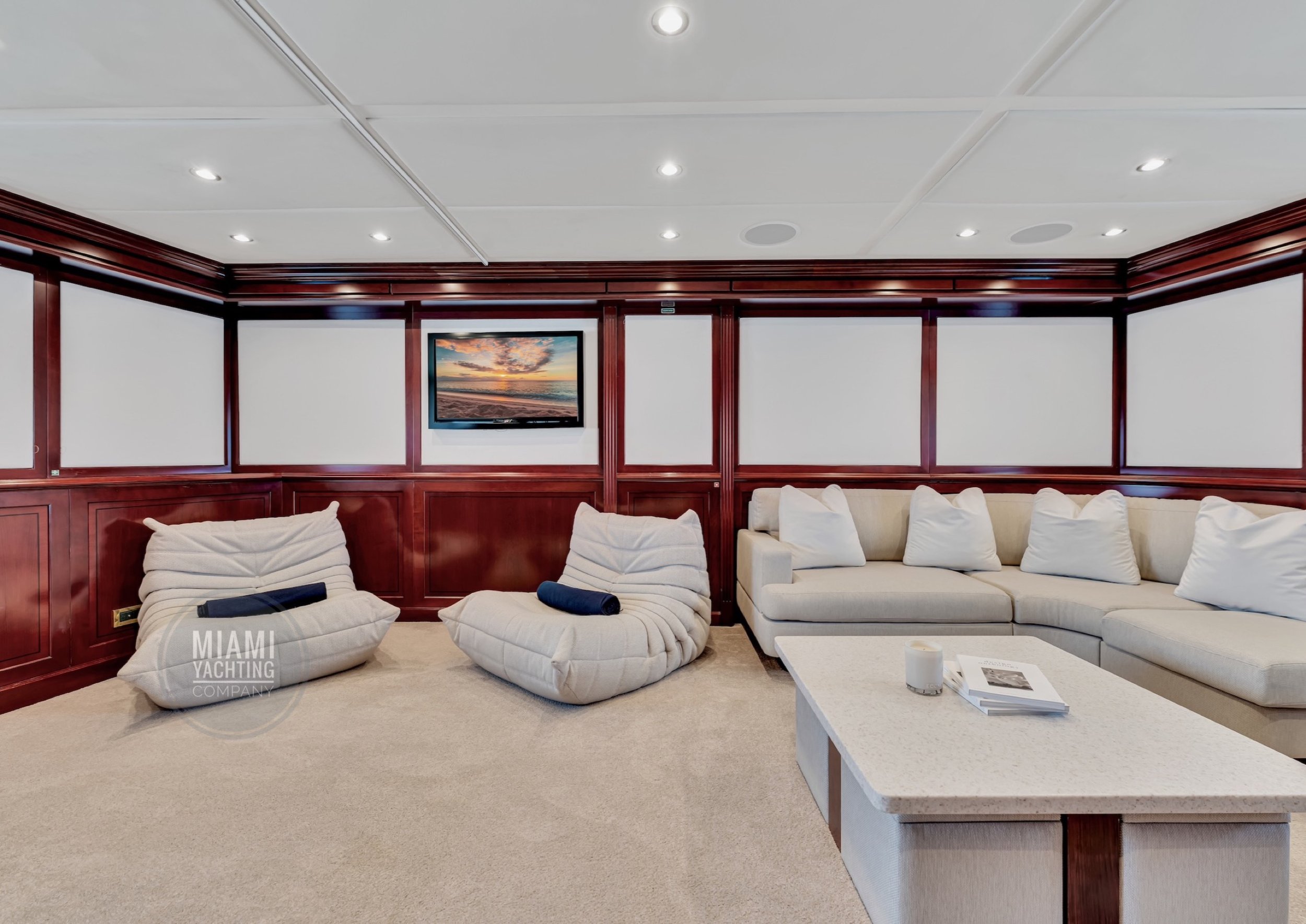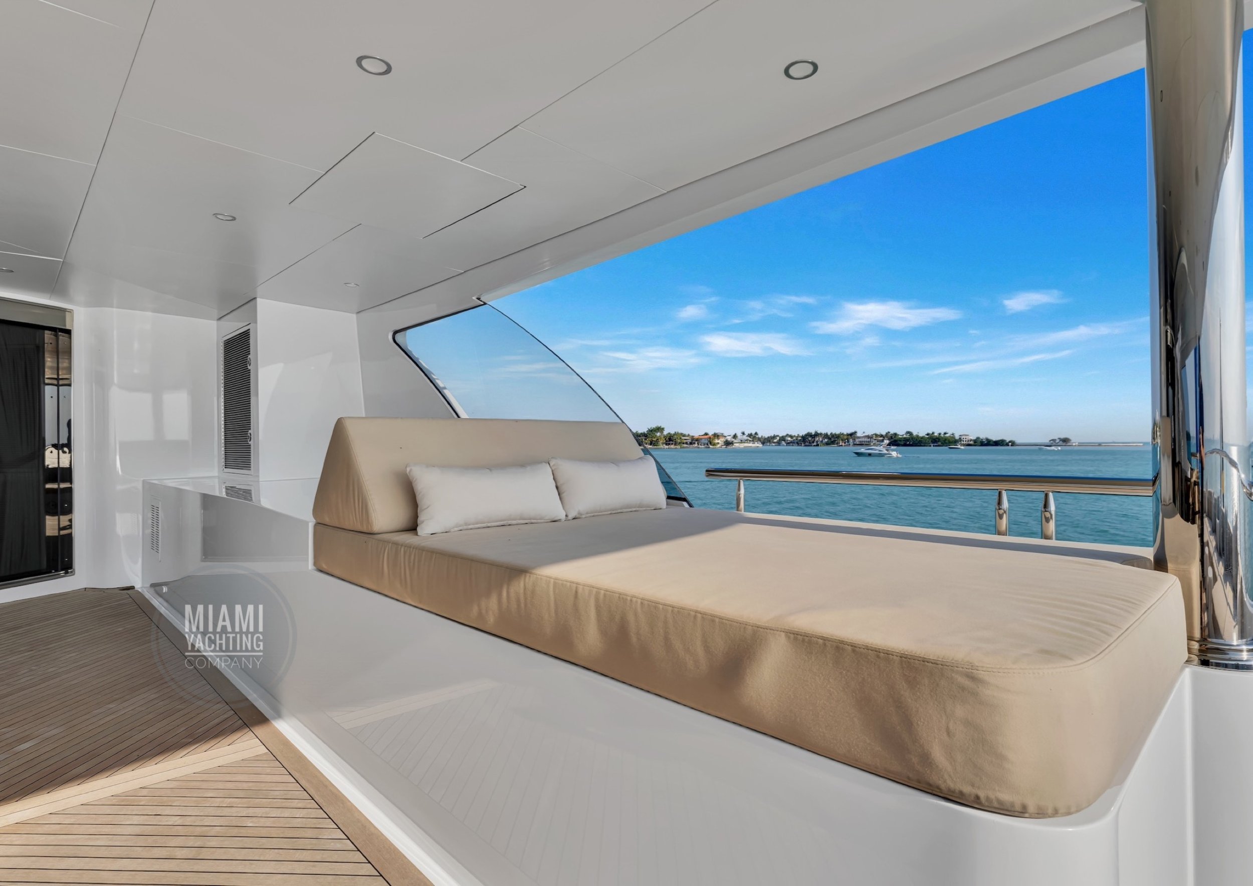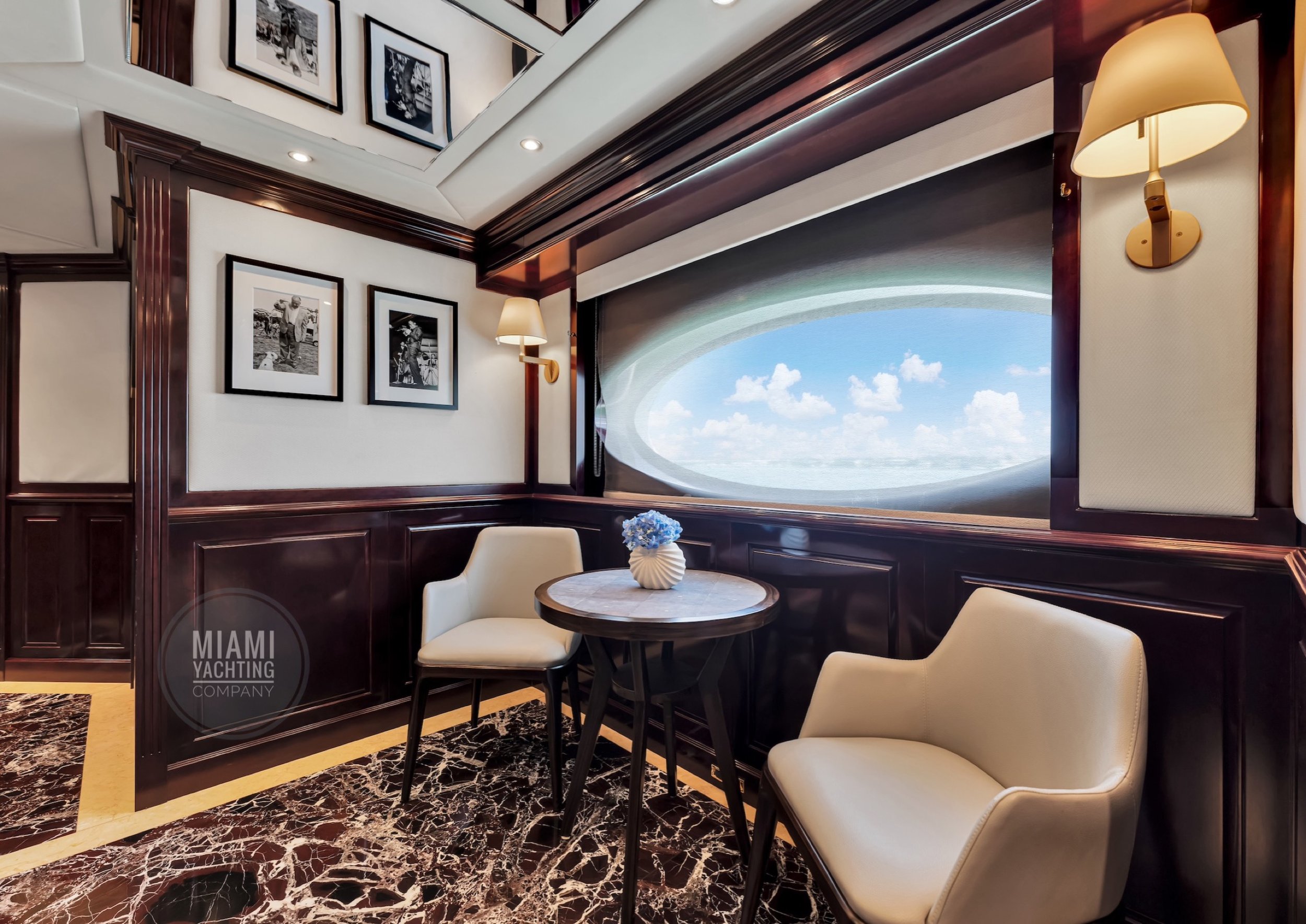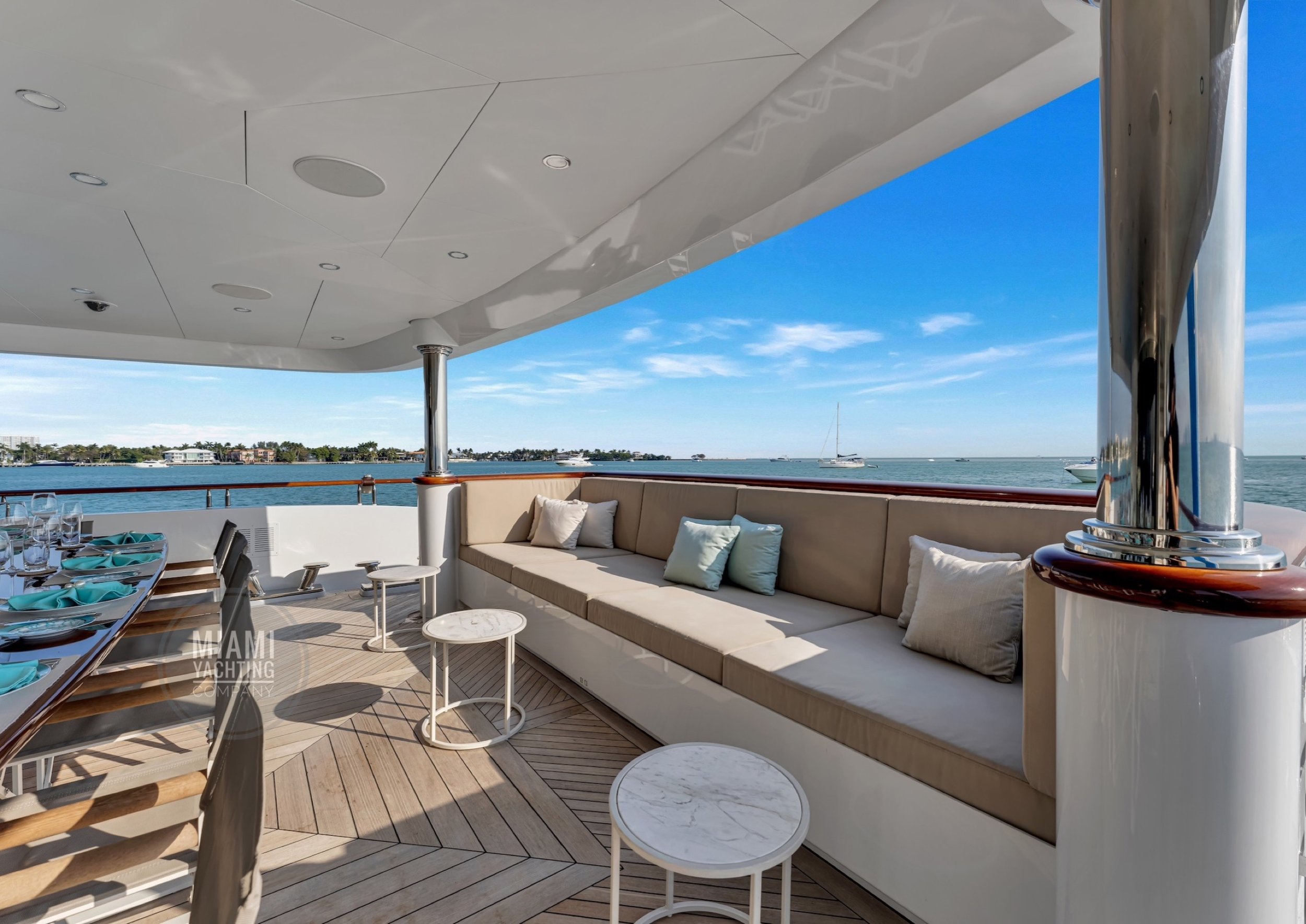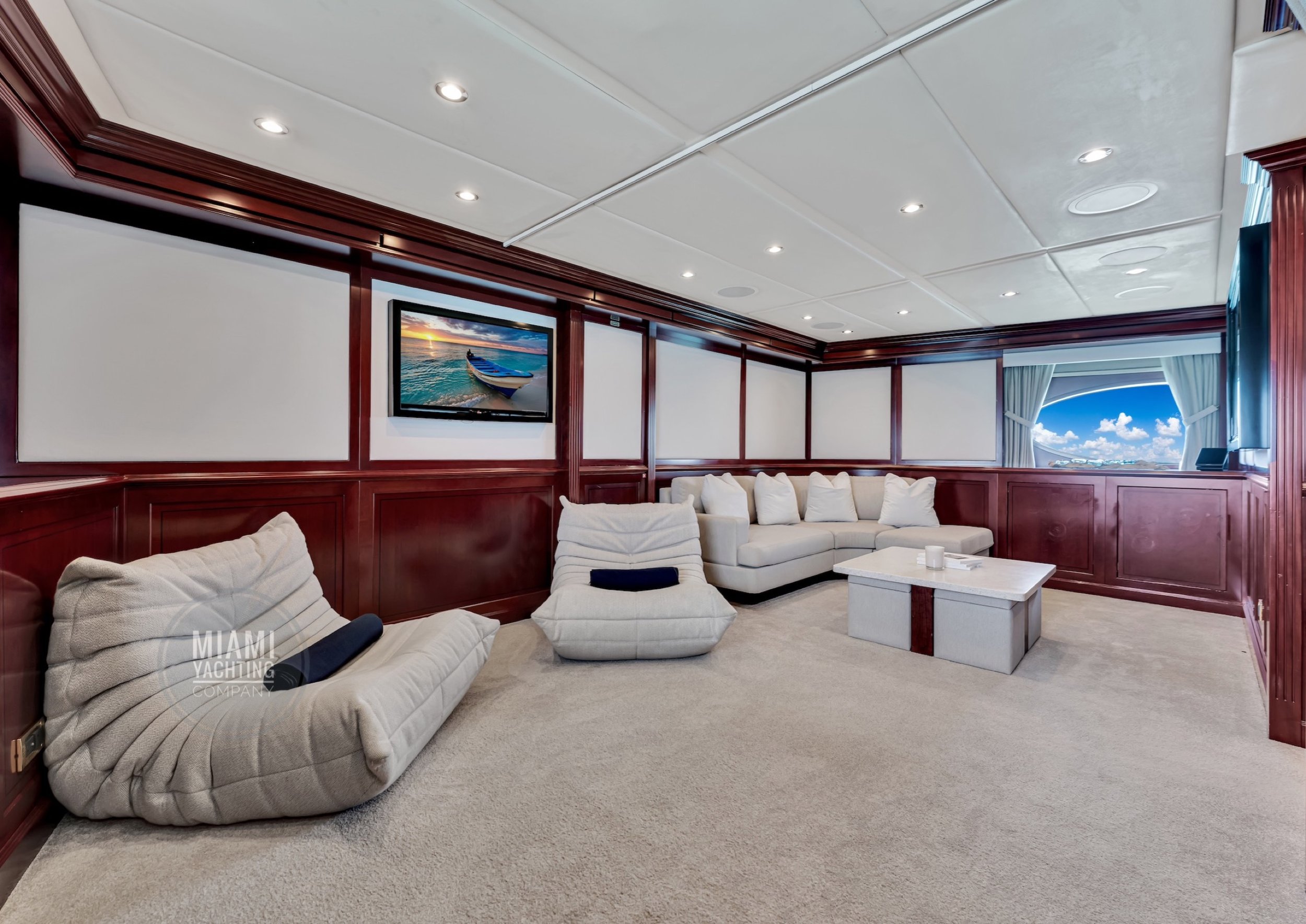 The interior is refined and contemporary, blending rich mahogany cabinetry with polished wood flooring and sleek black accents. The salon is bright and spacious with oversized windows, a formal dining area, and state-of-the-art entertainment systems. Every detail is crafted to provide an exceptional onboard experience that seamlessly combines style and relaxation for your Miami yacht charter.