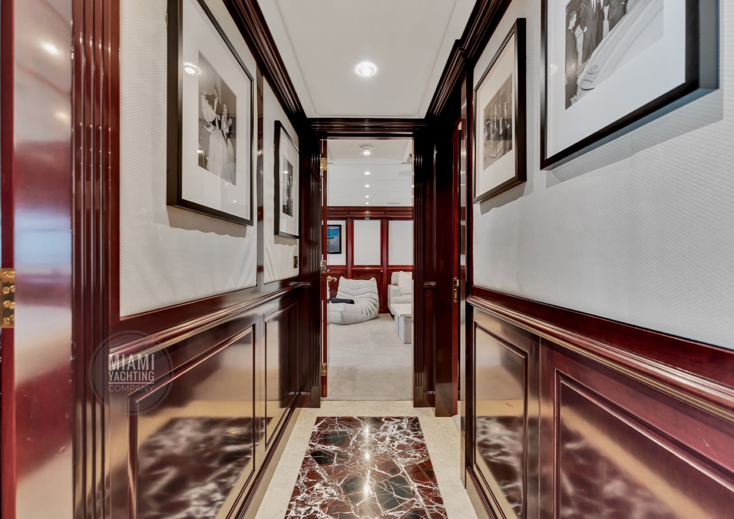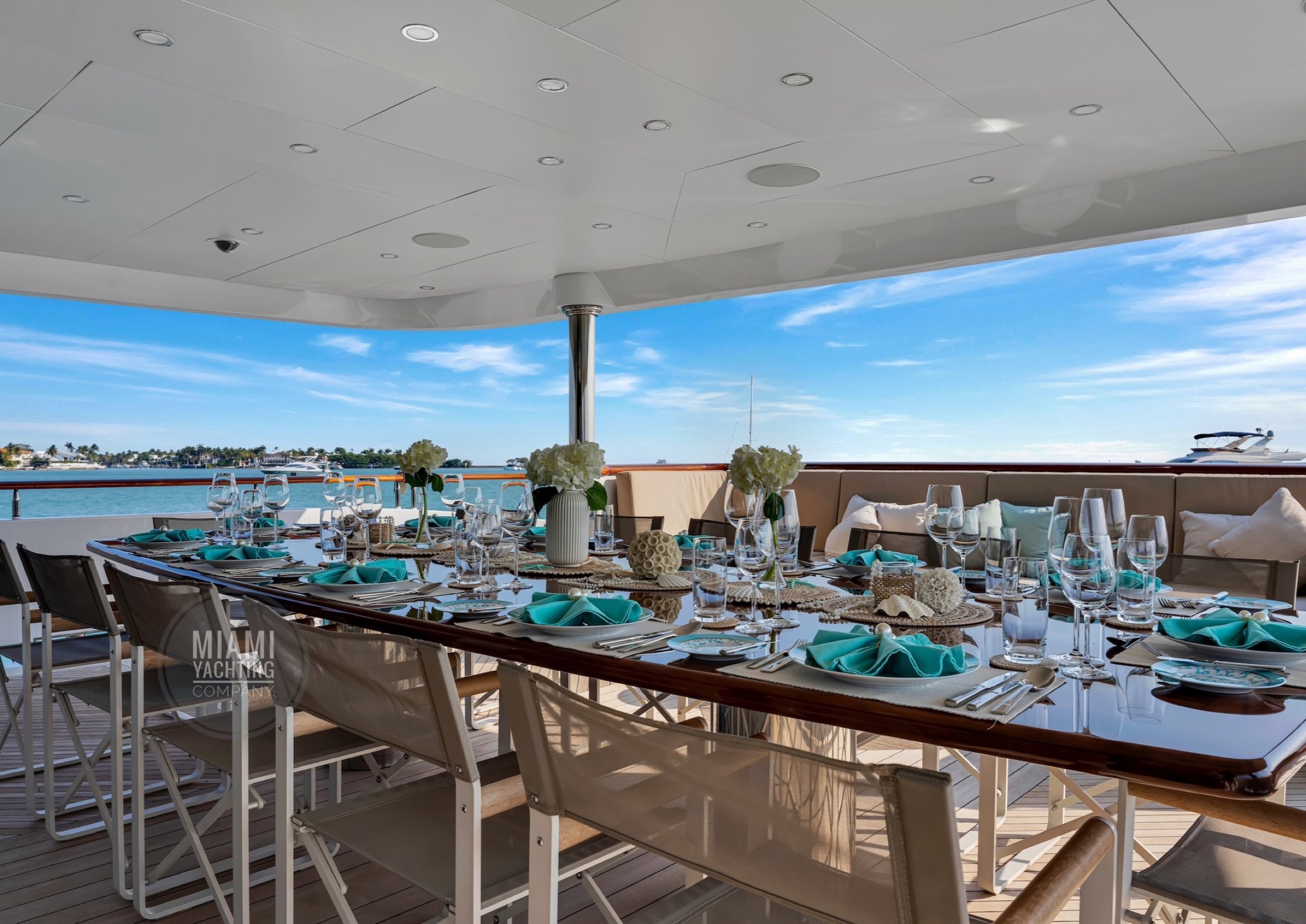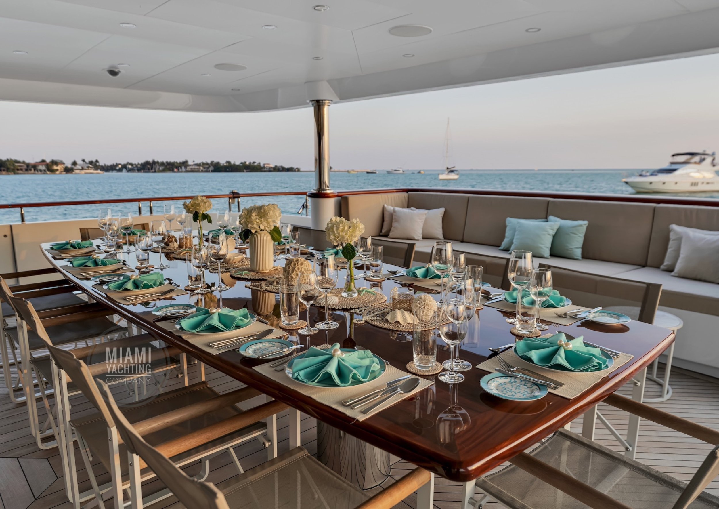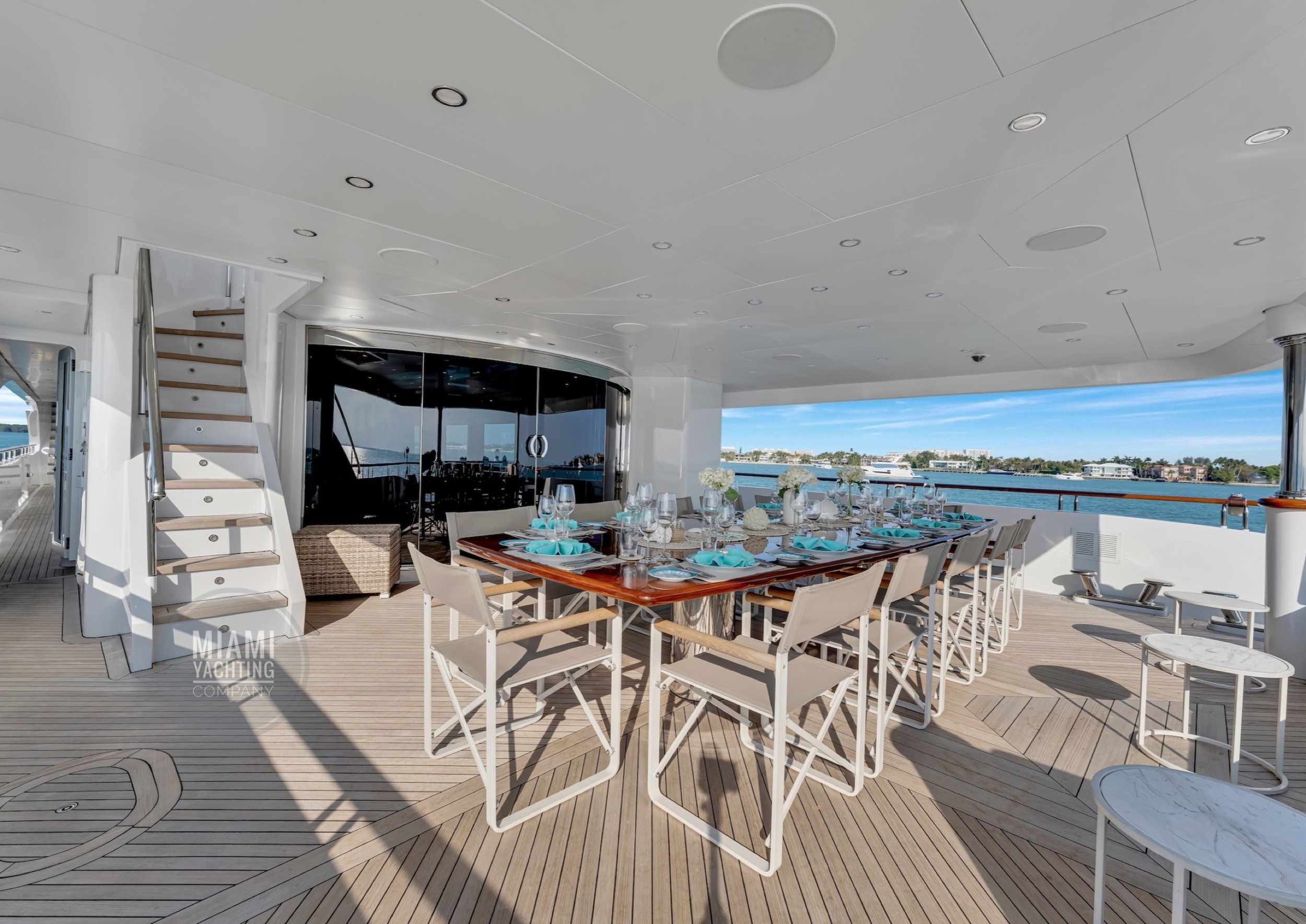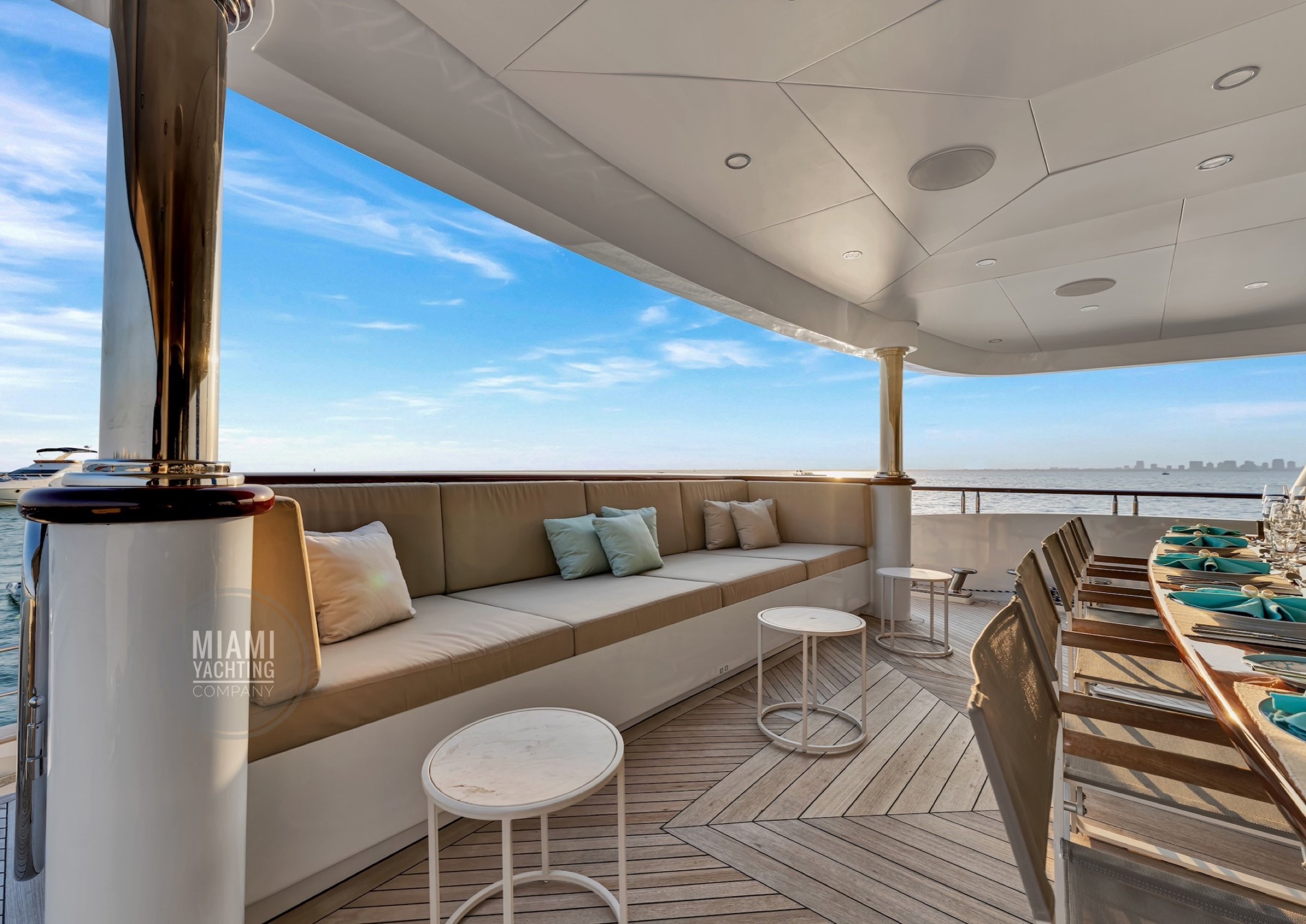 The interior is refined and contemporary, blending rich mahogany cabinetry with polished wood flooring and sleek black accents. The salon is bright and spacious with oversized windows, a formal dining area, and state-of-the-art entertainment systems. Every detail is crafted to provide an exceptional onboard experience that seamlessly combines style and relaxation for your Miami yacht charter.