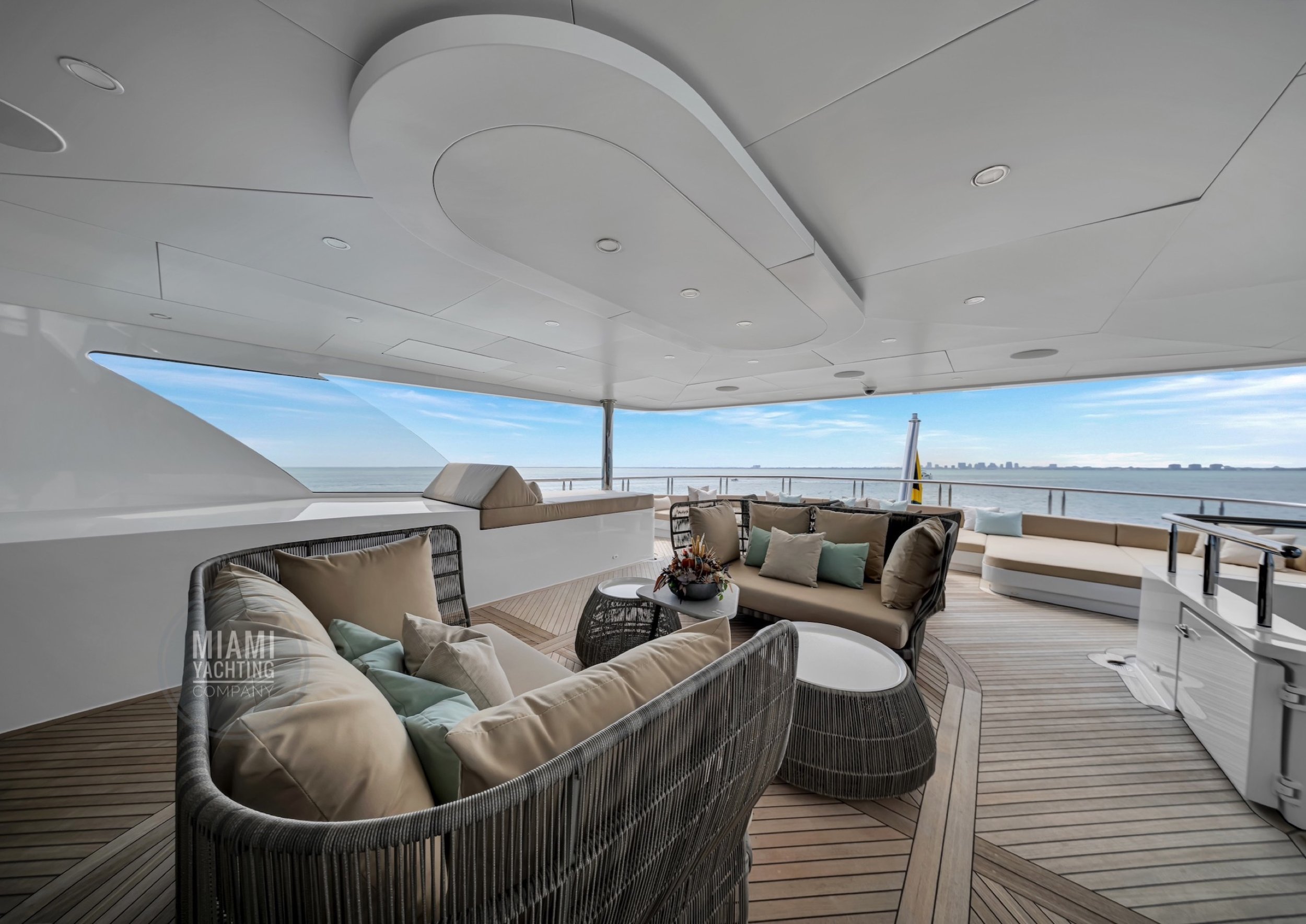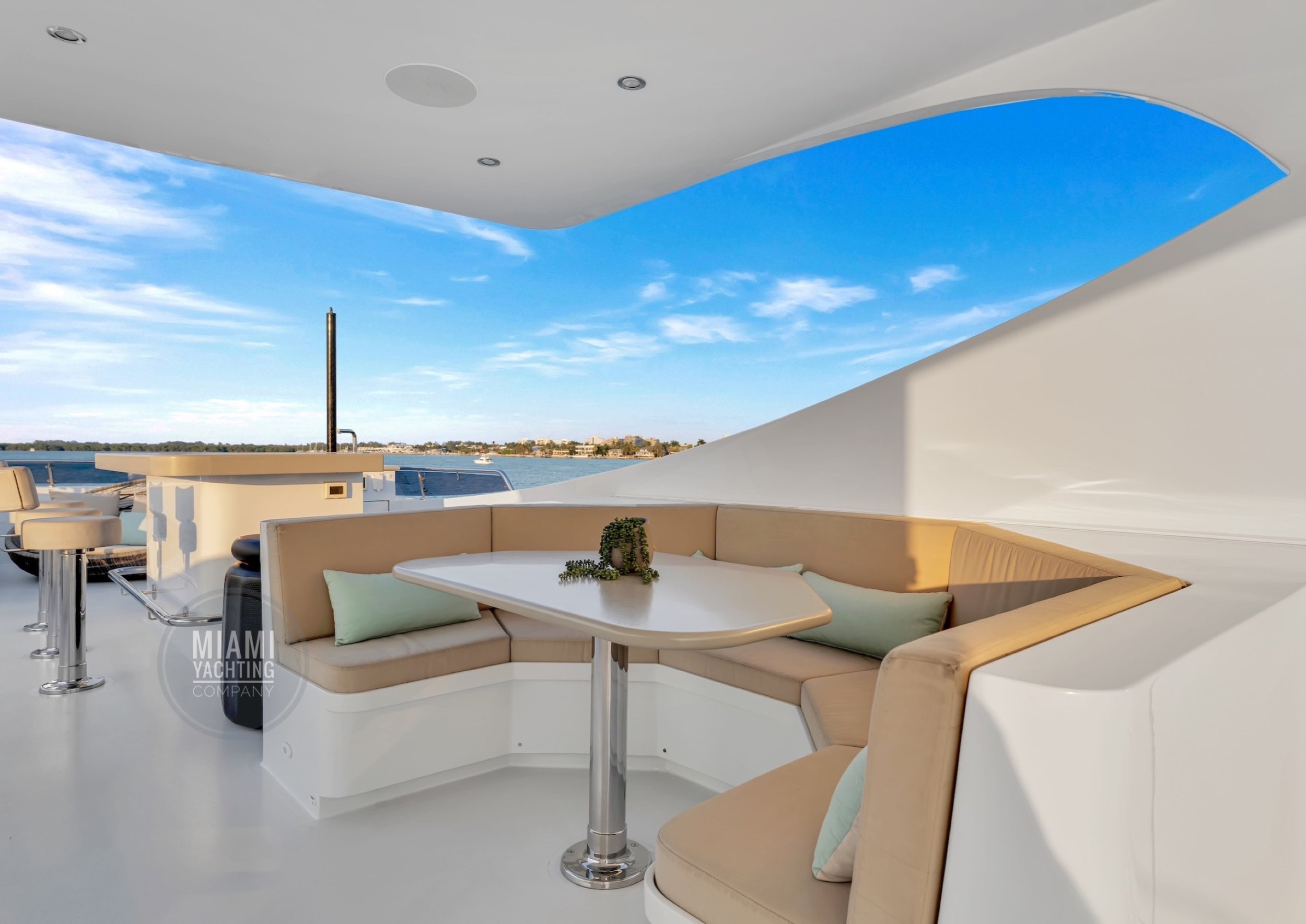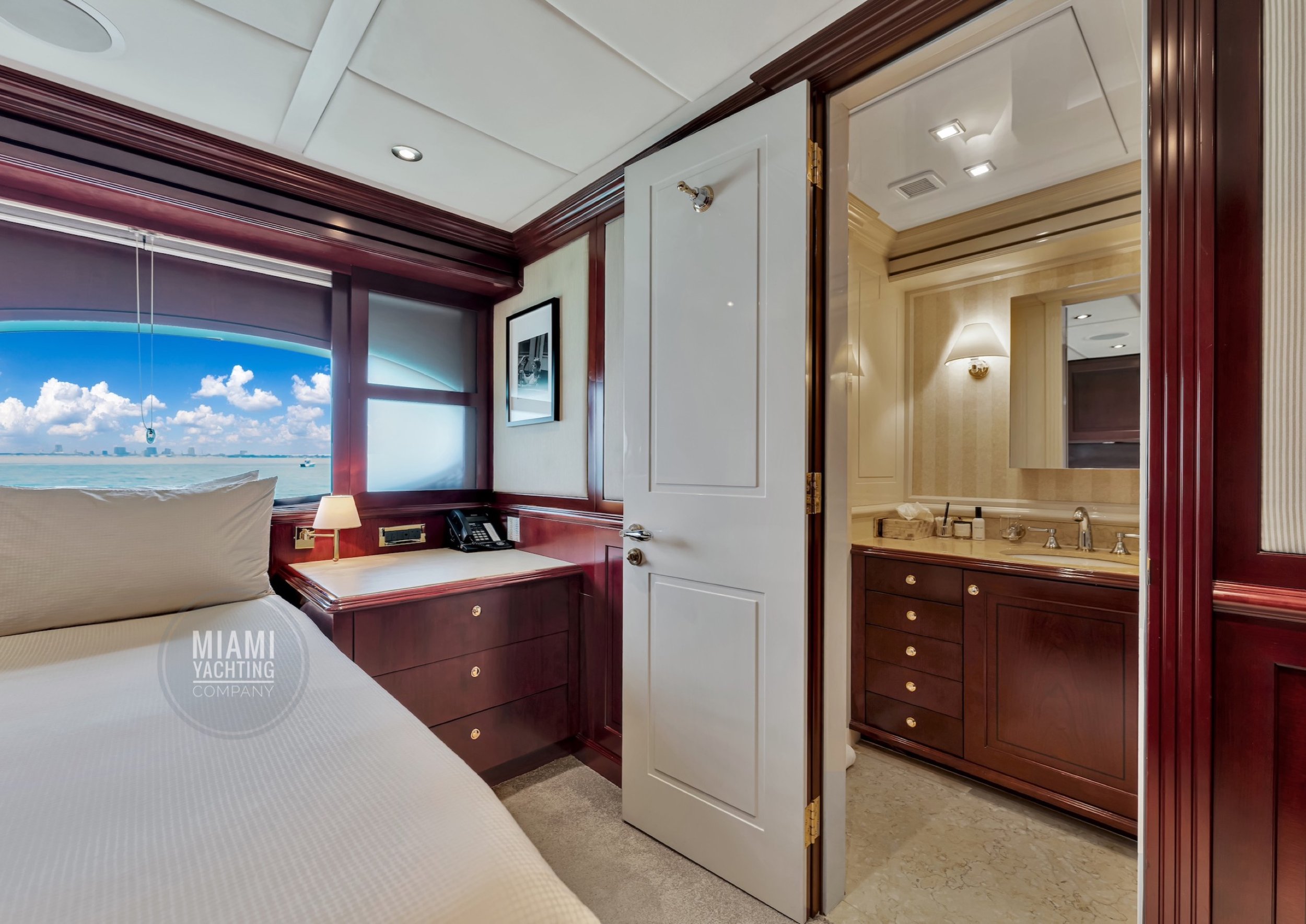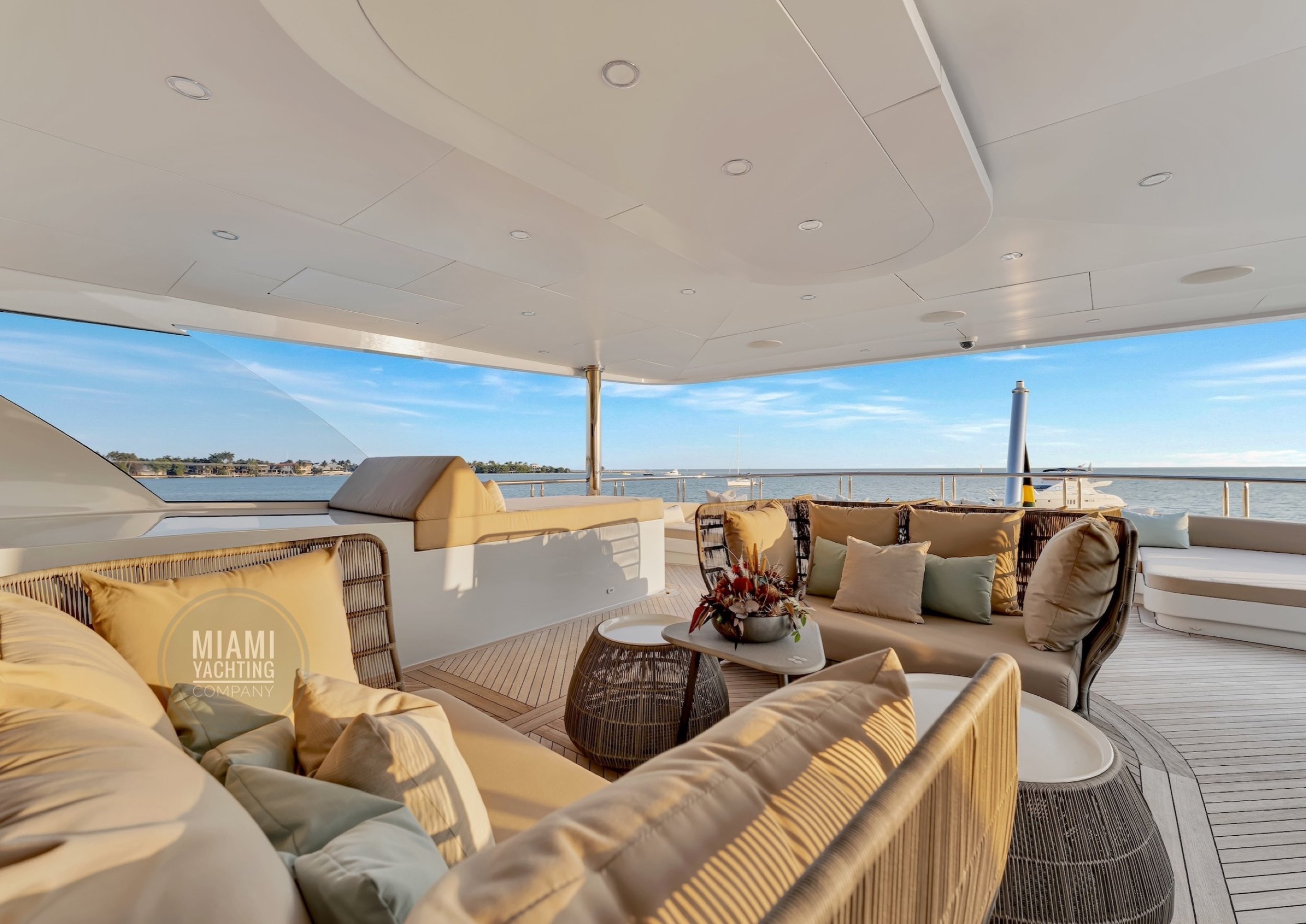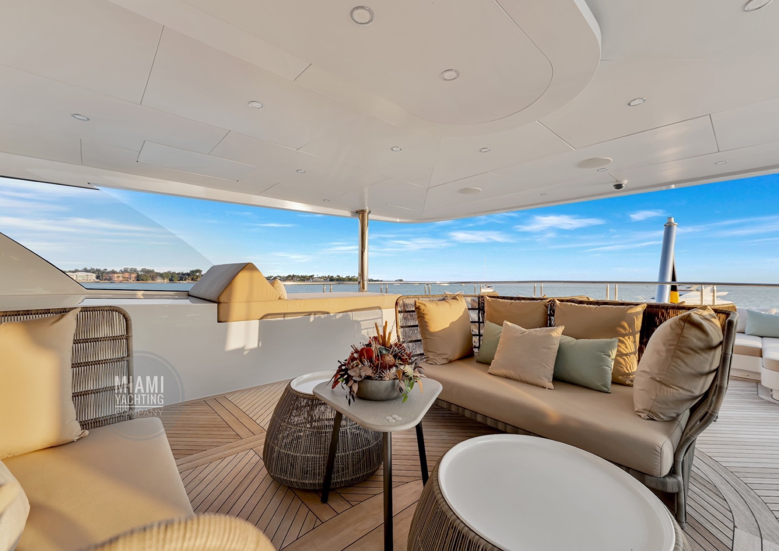 The interior is refined and contemporary, blending rich mahogany cabinetry with polished wood flooring and sleek black accents. The salon is bright and spacious with oversized windows, a formal dining area, and state-of-the-art entertainment systems. Every detail is crafted to provide an exceptional onboard experience that seamlessly combines style and relaxation for your Miami yacht charter.