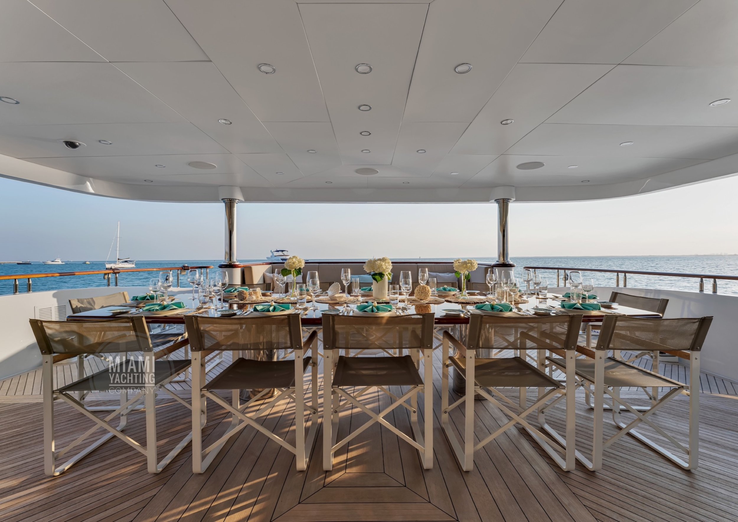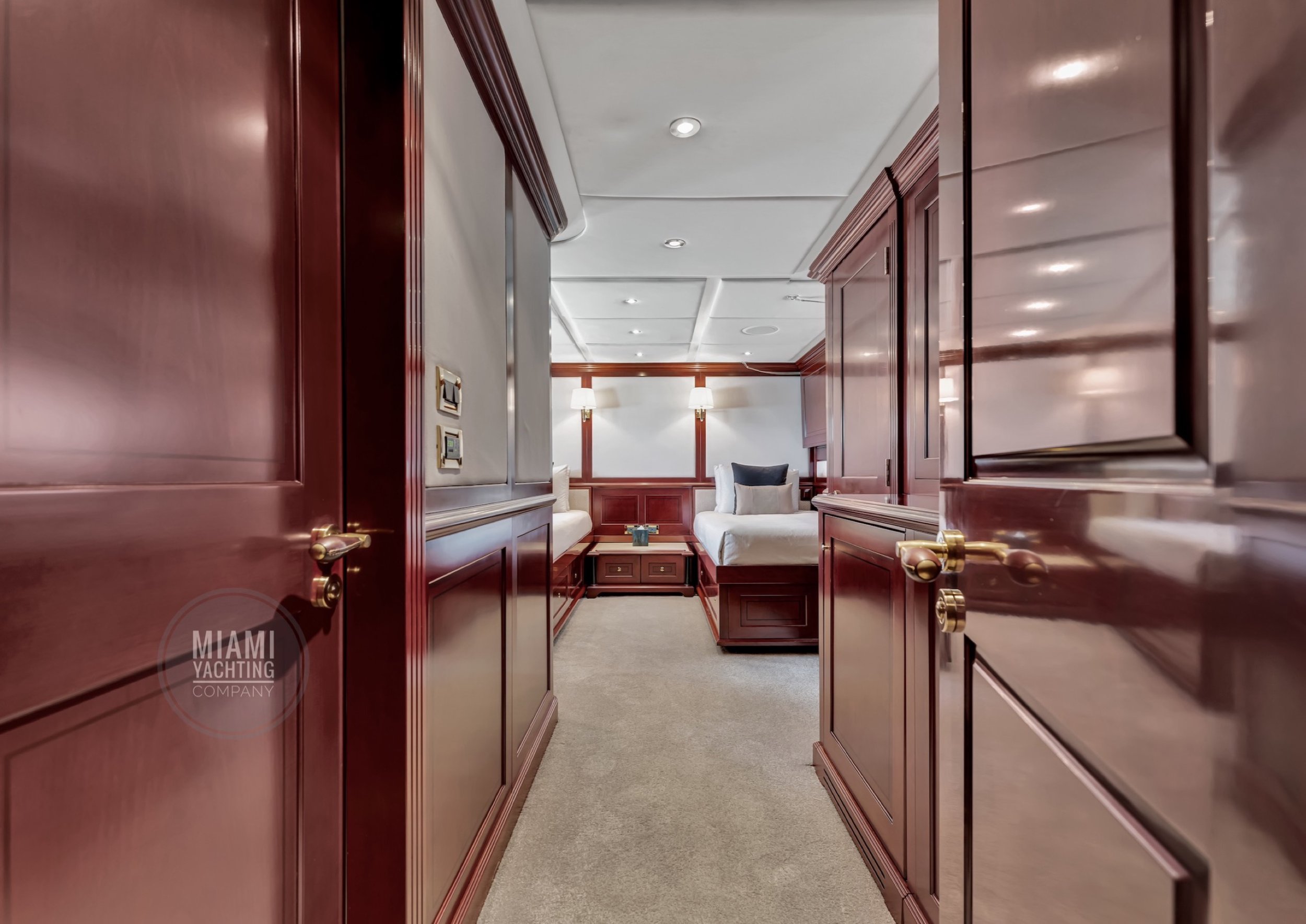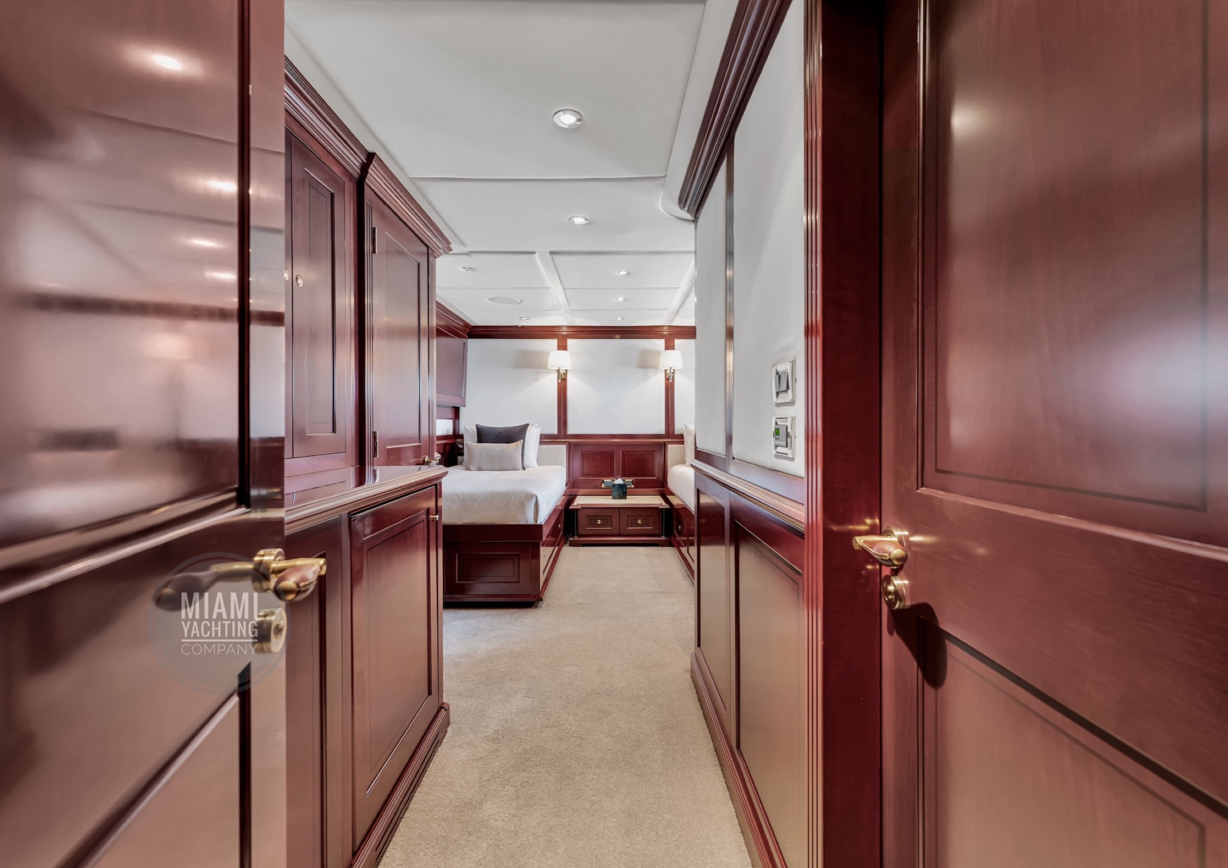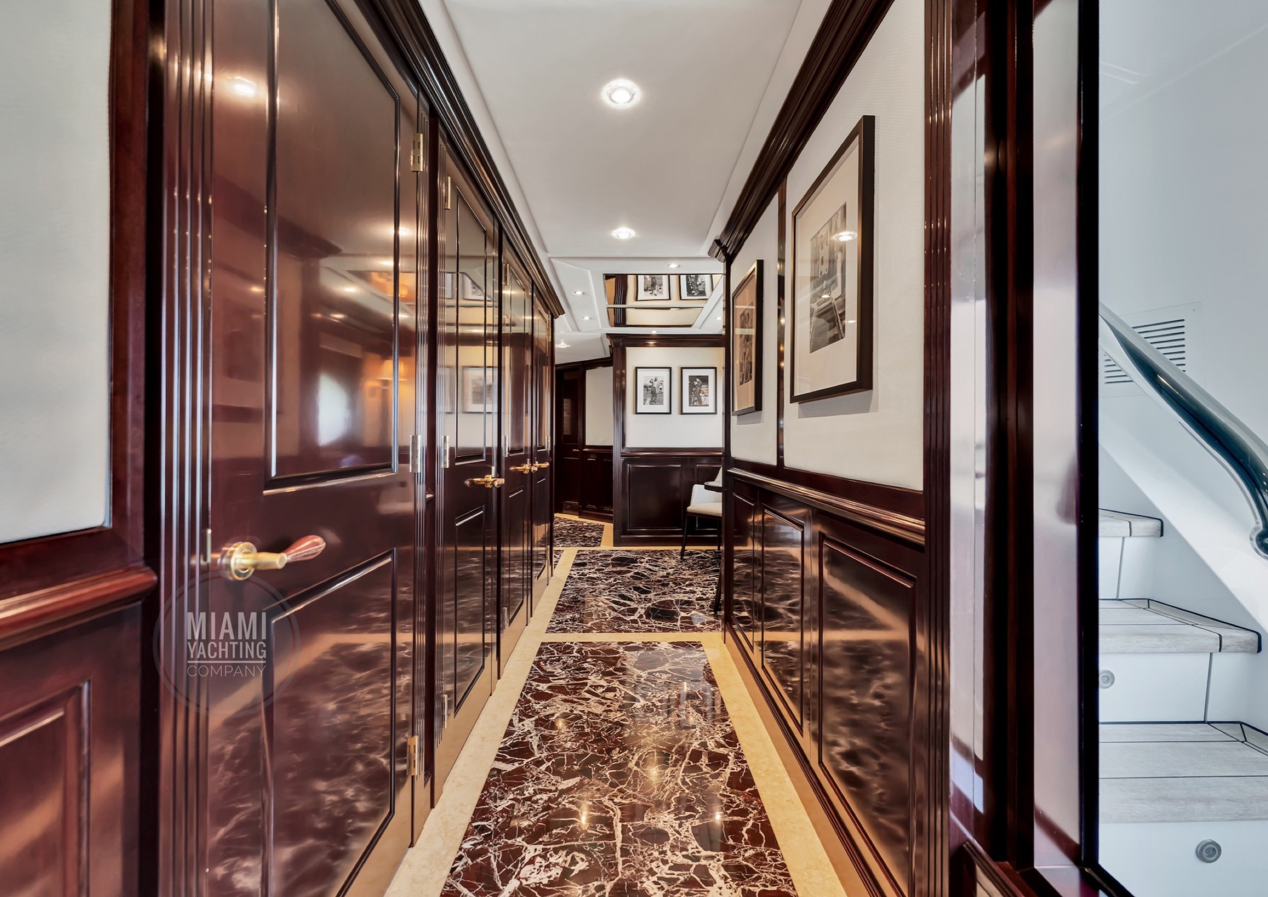 The interior is refined and contemporary, blending rich mahogany cabinetry with polished wood flooring and sleek black accents. The salon is bright and spacious with oversized windows, a formal dining area, and state-of-the-art entertainment systems. Every detail is crafted to provide an exceptional onboard experience that seamlessly combines style and relaxation for your Miami yacht charter.