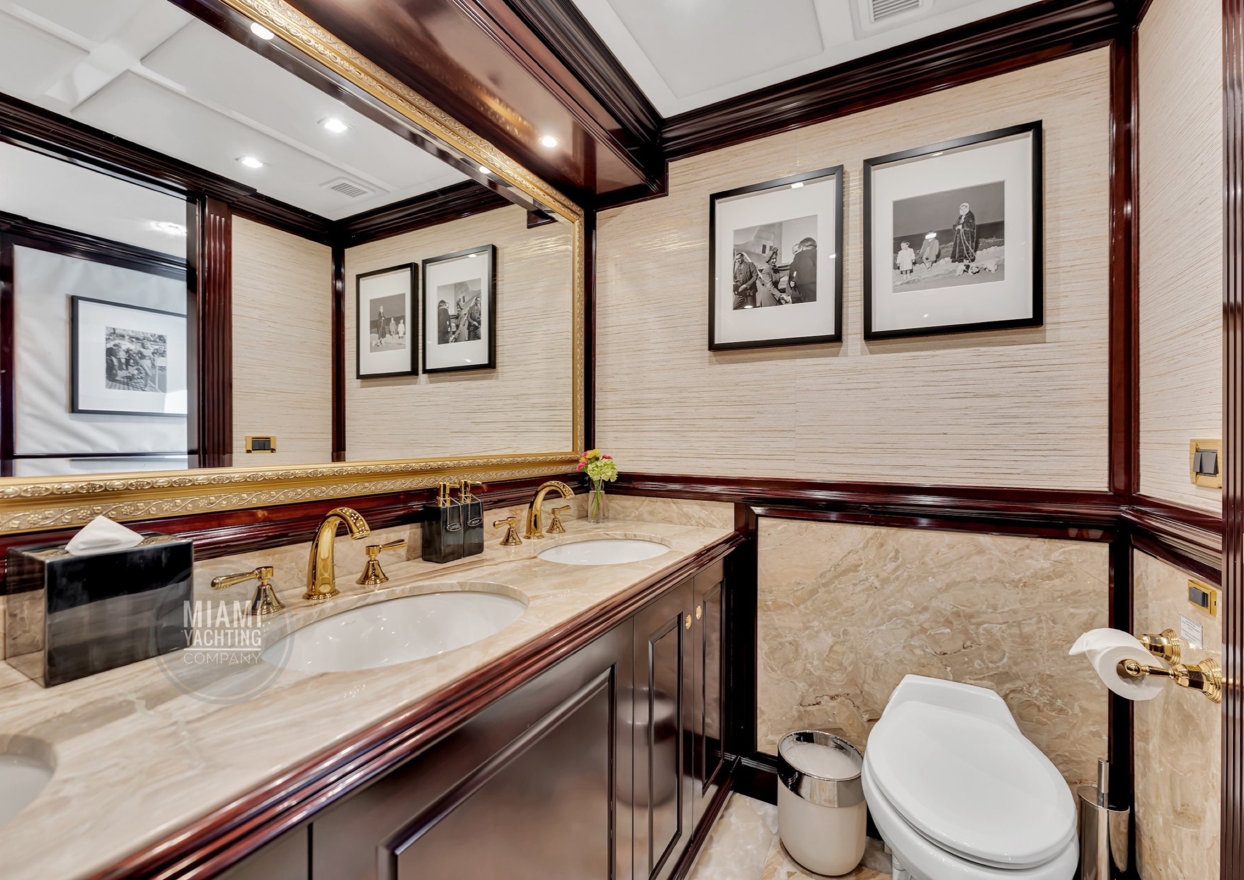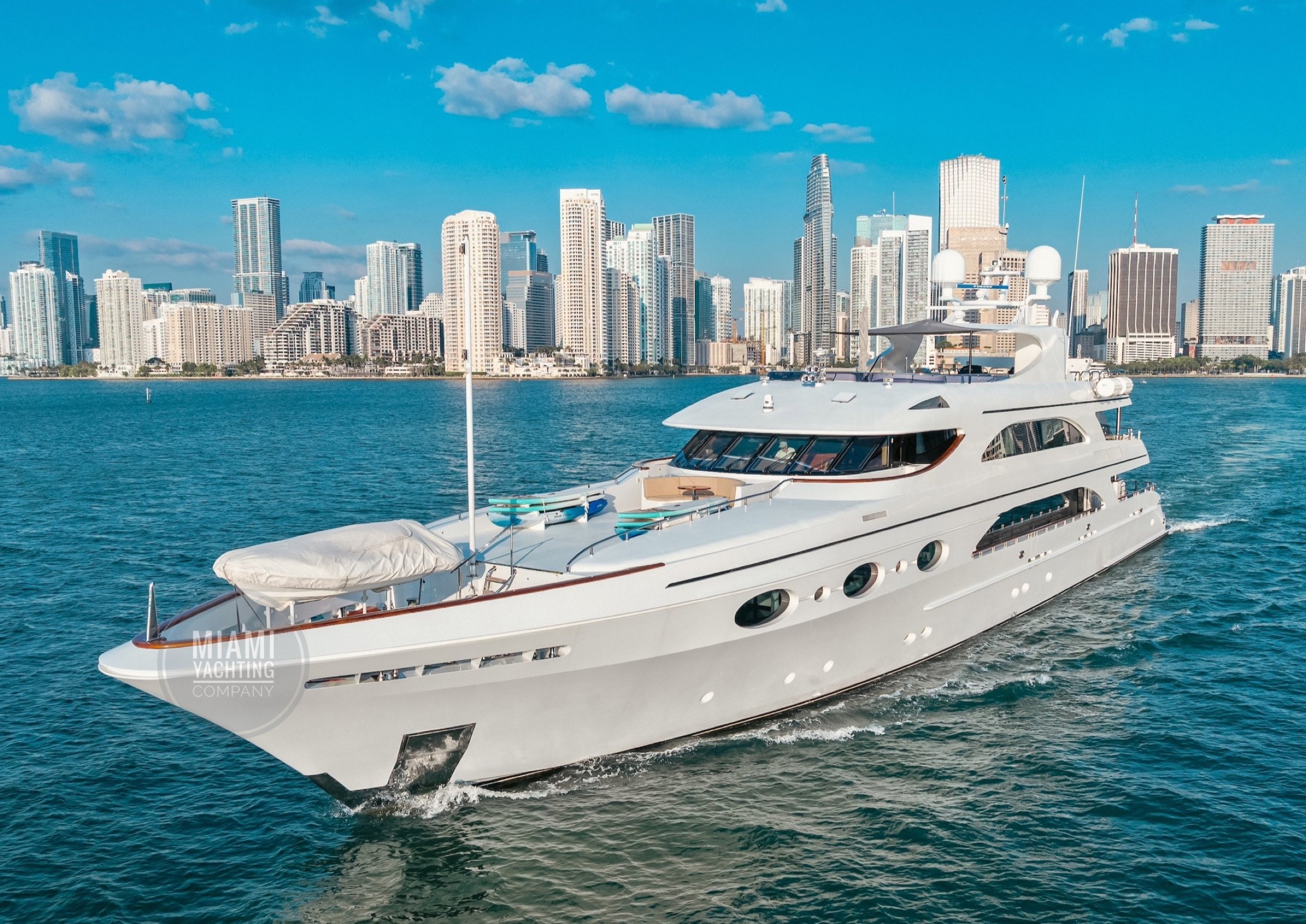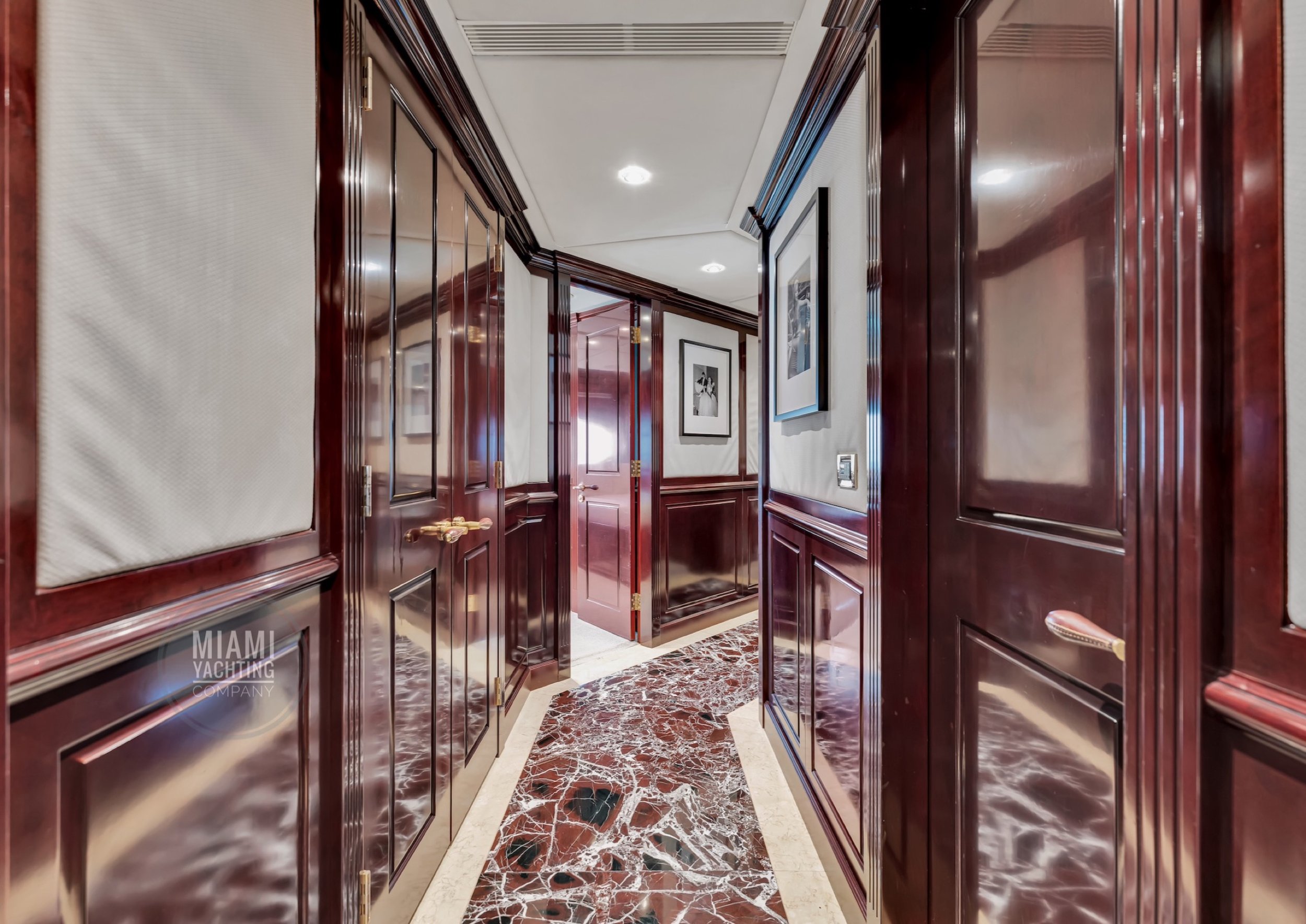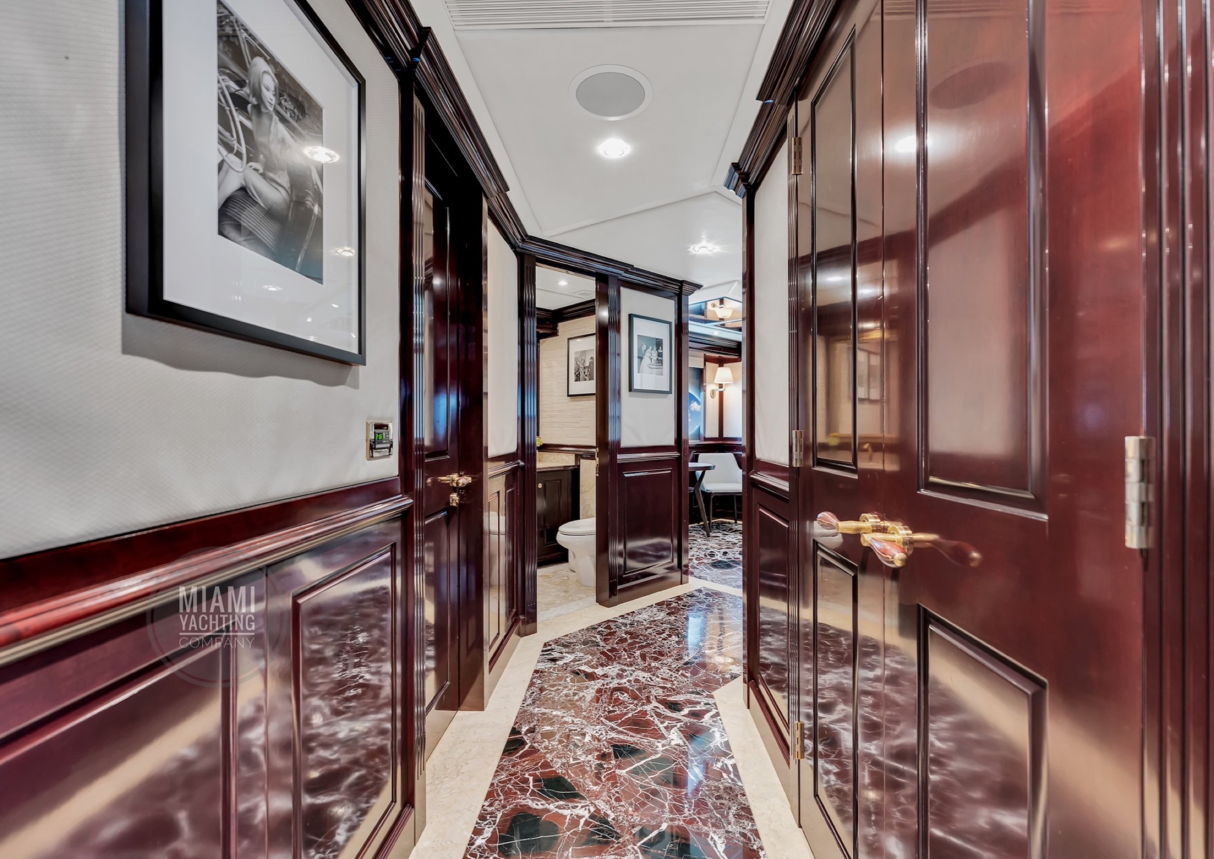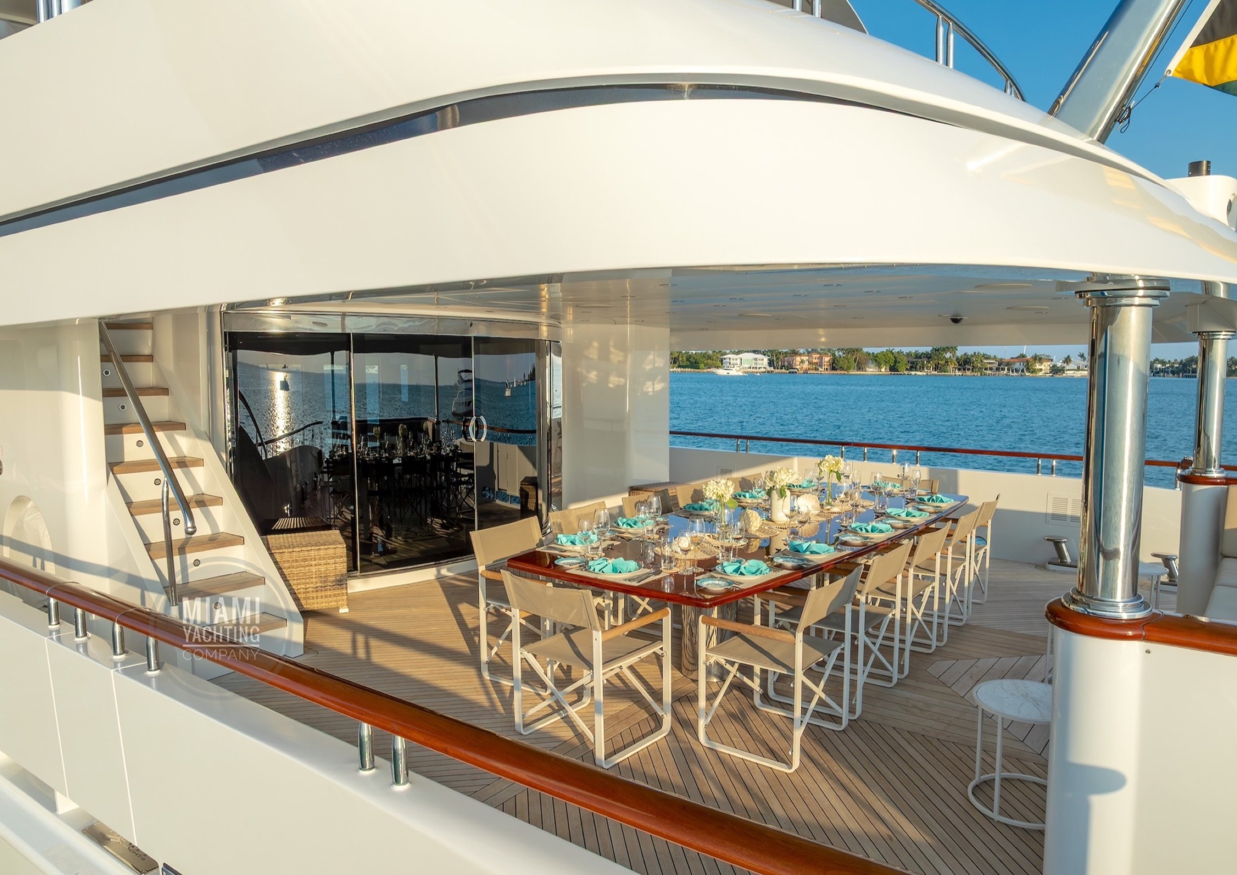 The interior is refined and contemporary, blending rich mahogany cabinetry with polished wood flooring and sleek black accents. The salon is bright and spacious with oversized windows, a formal dining area, and state-of-the-art entertainment systems. Every detail is crafted to provide an exceptional onboard experience that seamlessly combines style and relaxation for your Miami yacht charter.