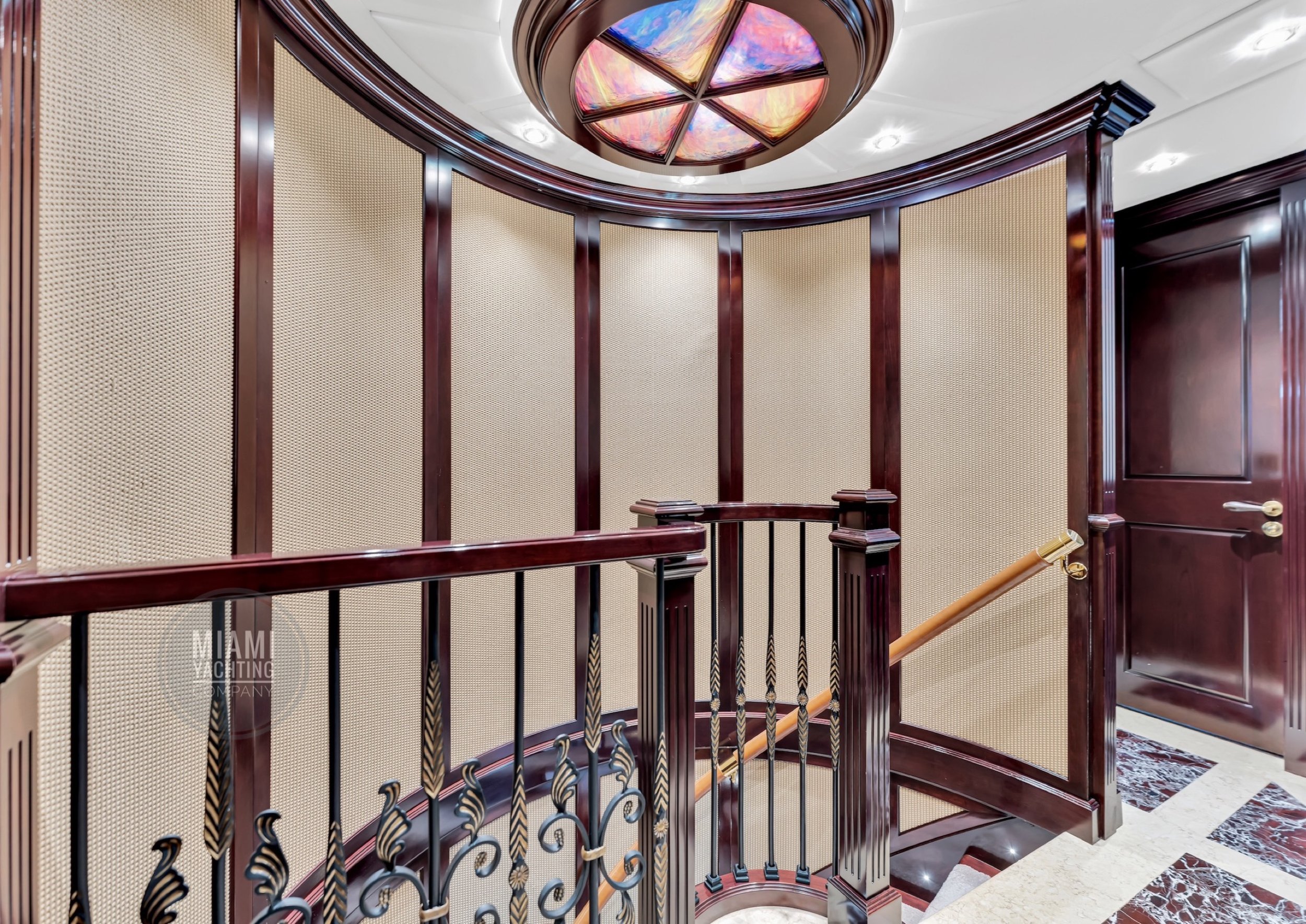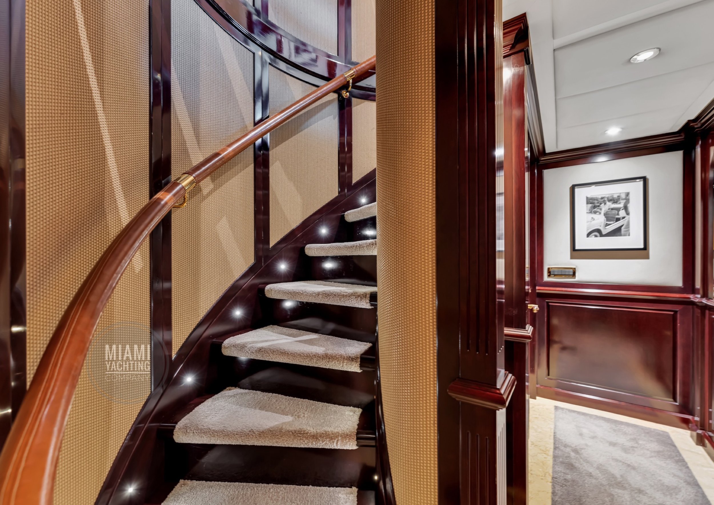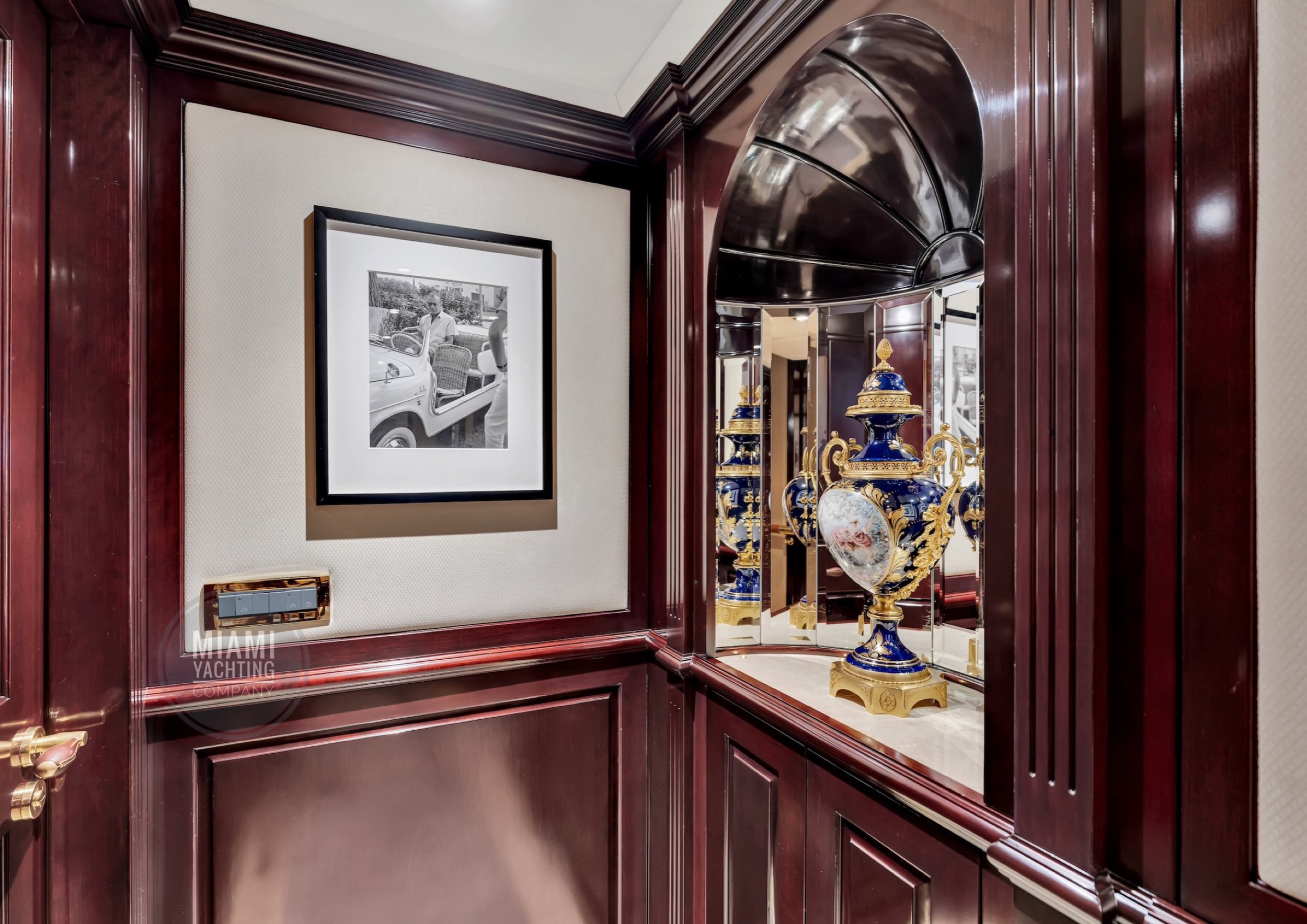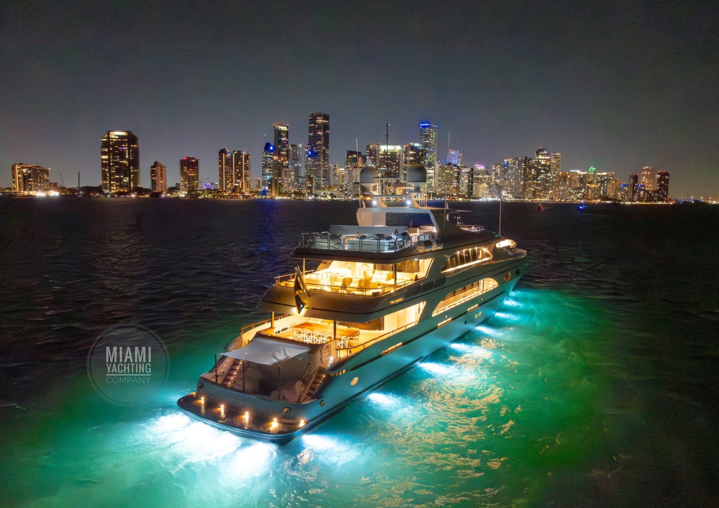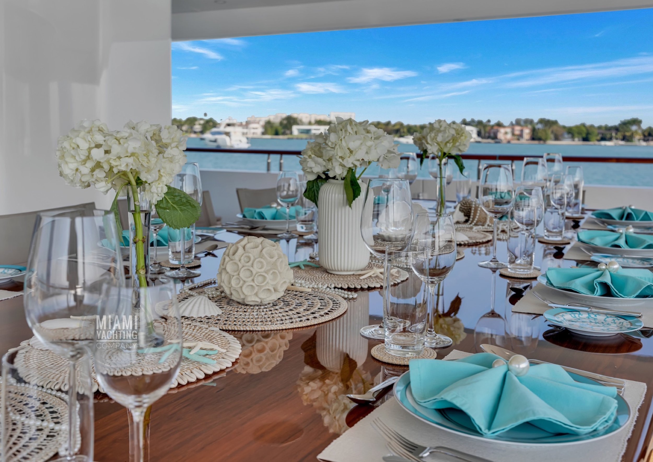 The interior is refined and contemporary, blending rich mahogany cabinetry with polished wood flooring and sleek black accents. The salon is bright and spacious with oversized windows, a formal dining area, and state-of-the-art entertainment systems. Every detail is crafted to provide an exceptional onboard experience that seamlessly combines style and relaxation for your Miami yacht charter.