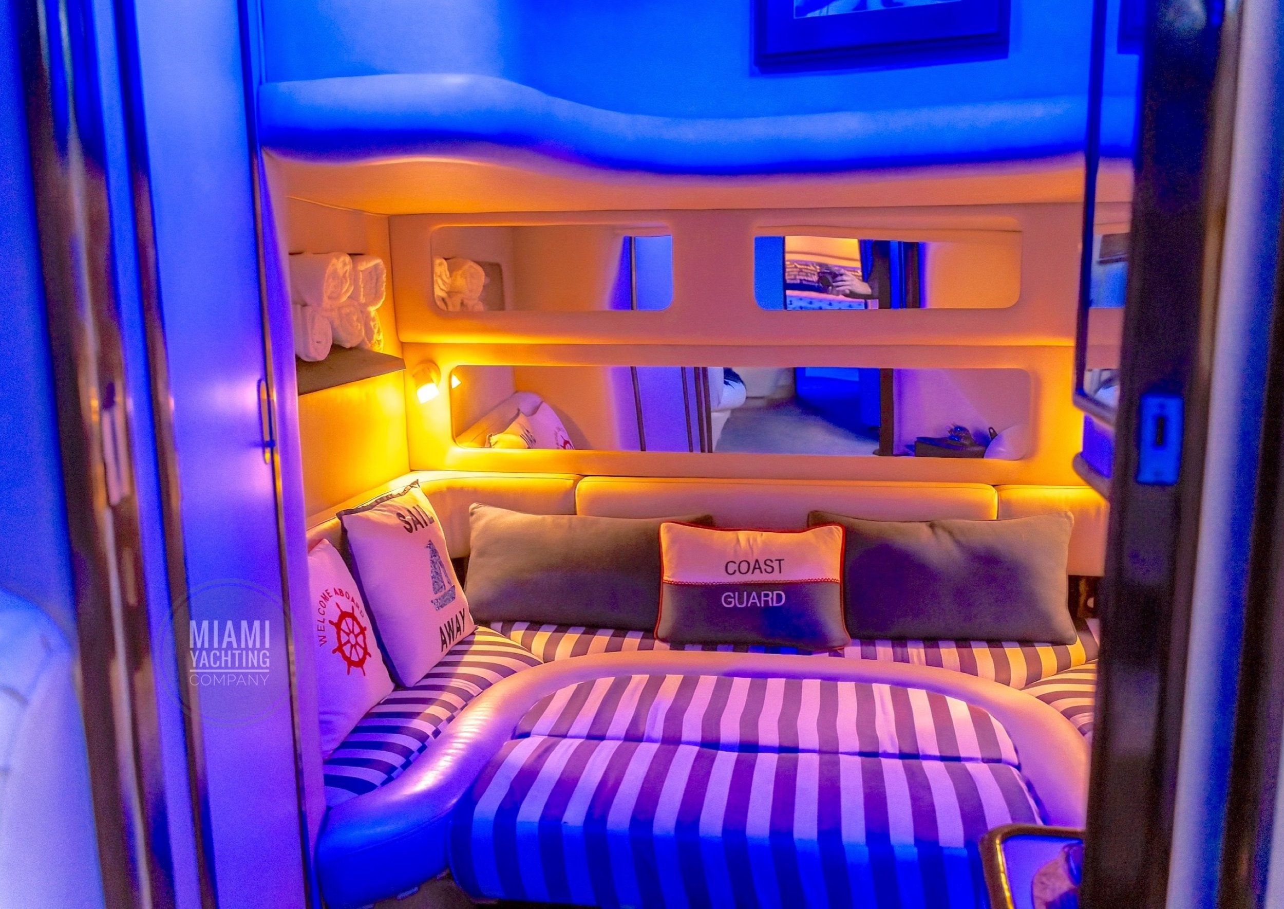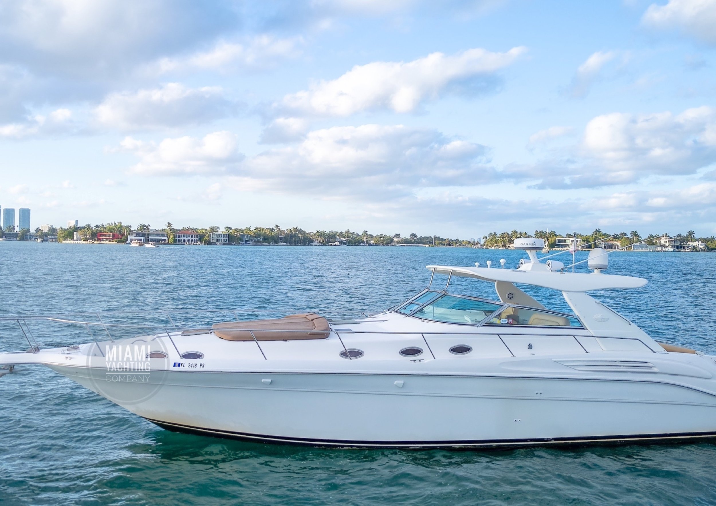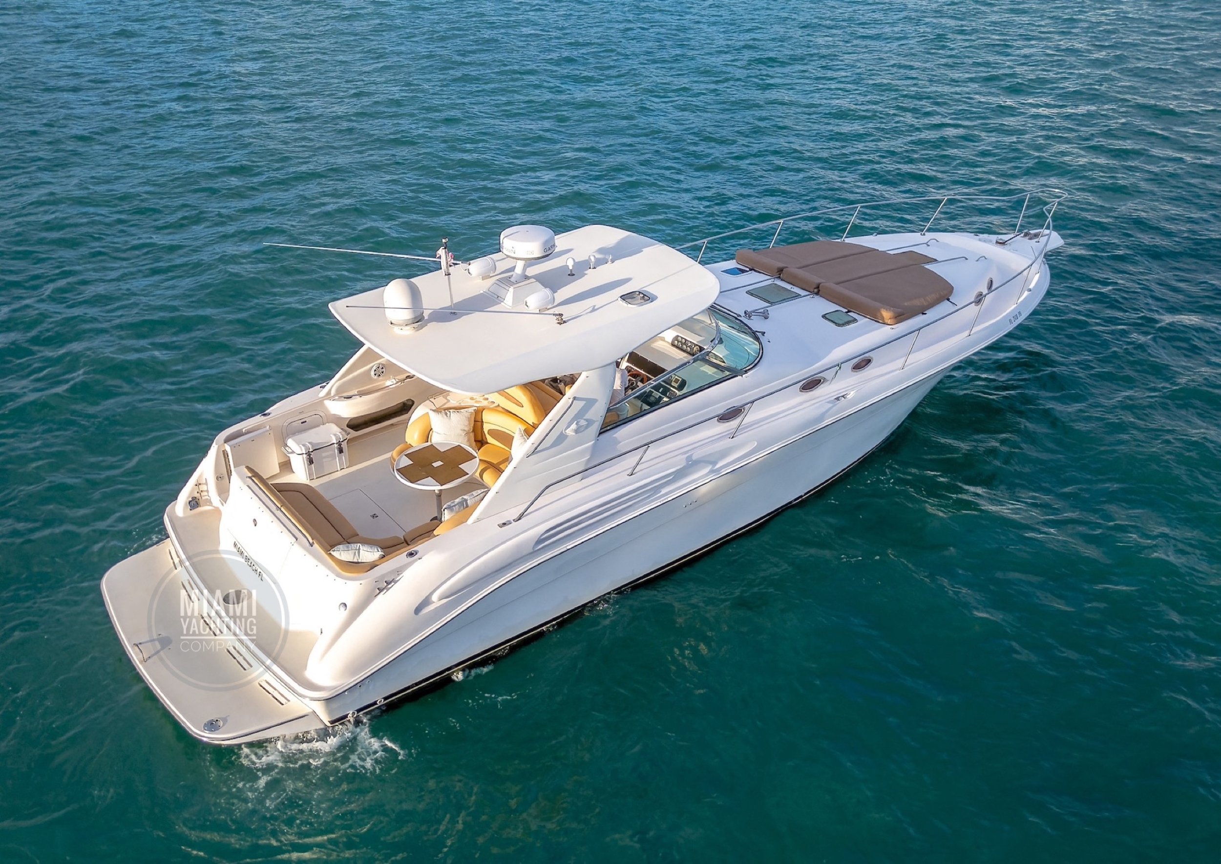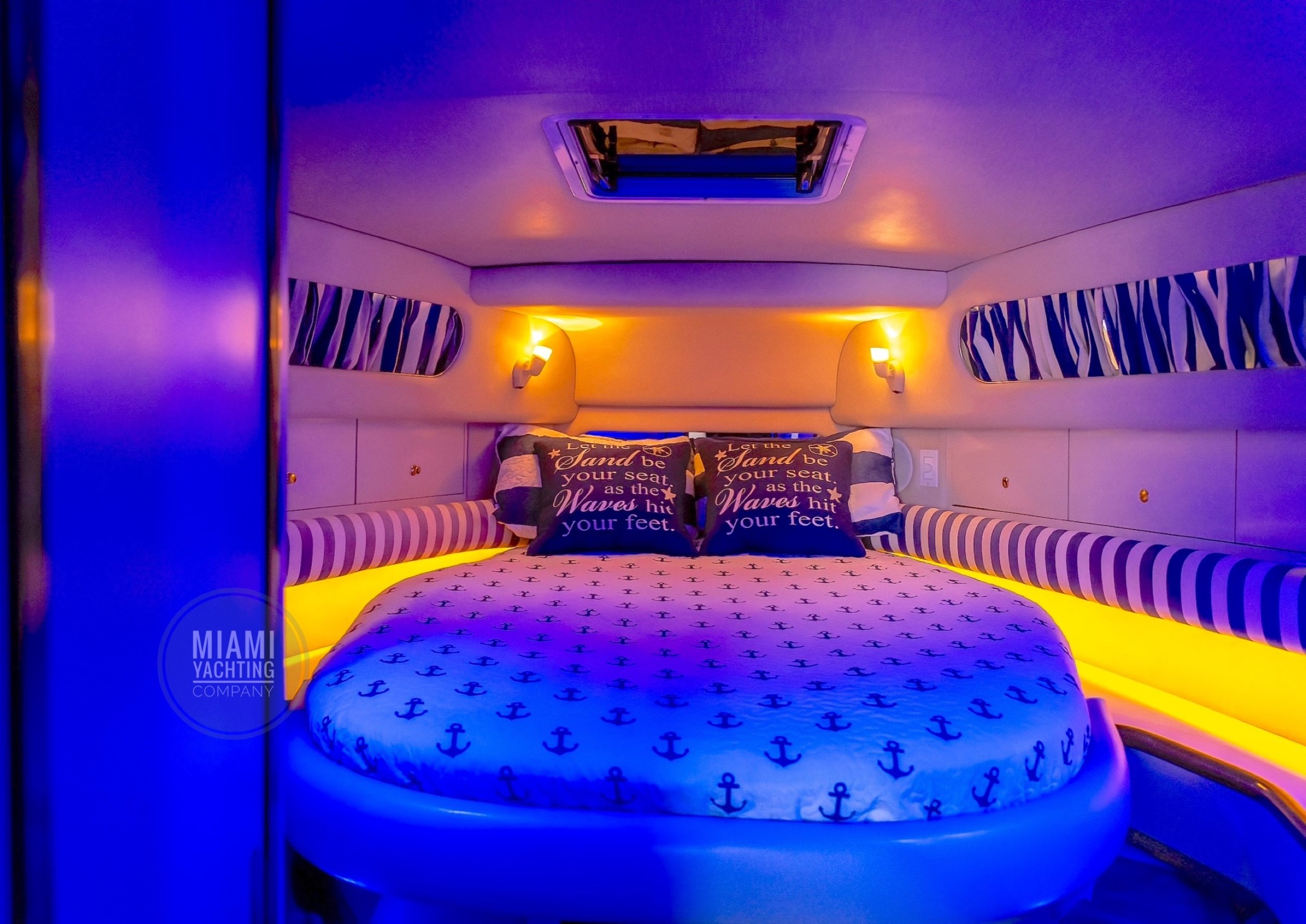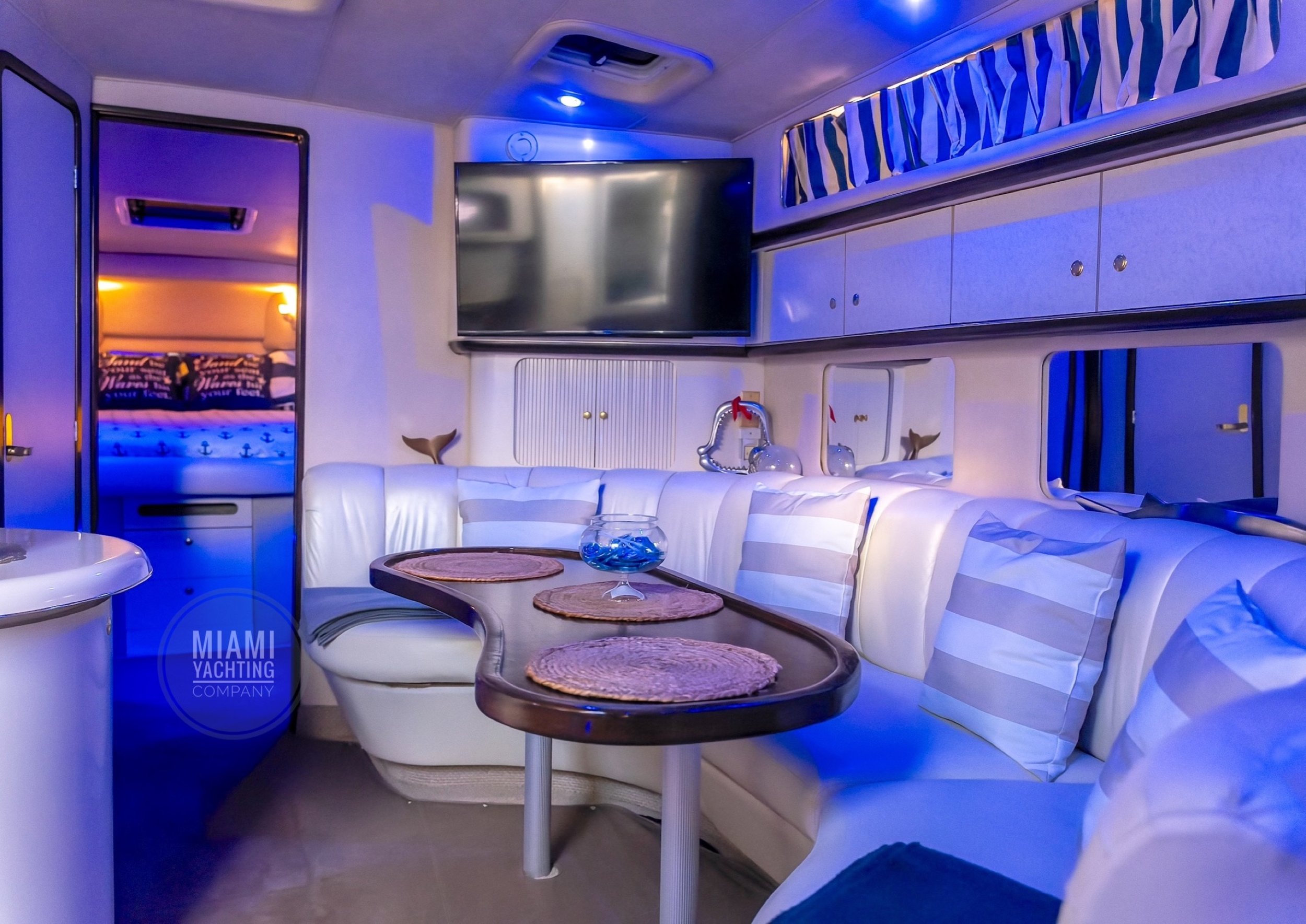This 48 ft Sea Ray offers the perfect blend of timeless design and modern comfort, making it one of the most well-rounded choices for a Miami yacht rental. Fully refit from bow to stern, the yacht now features upgraded upholstery, sleek new flooring, an enhanced sound system with Bluetooth connectivity, ambient lighting, and a refreshed interior that feels more like a modern lounge than a traditional cabin cruiser.