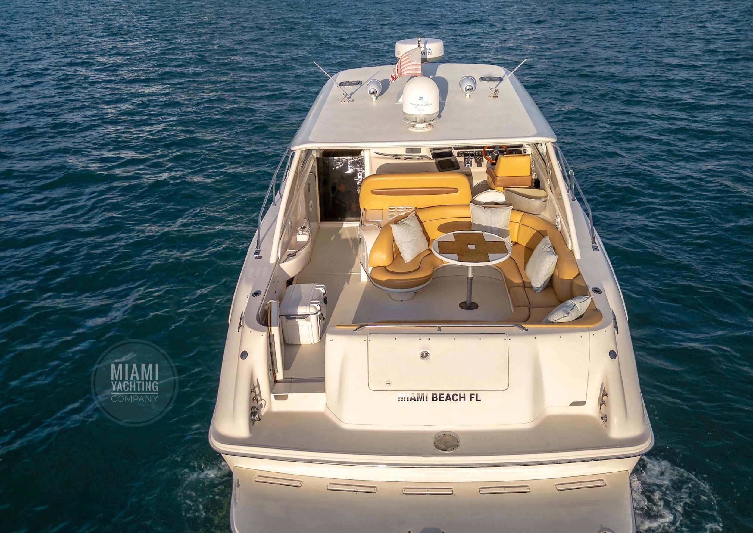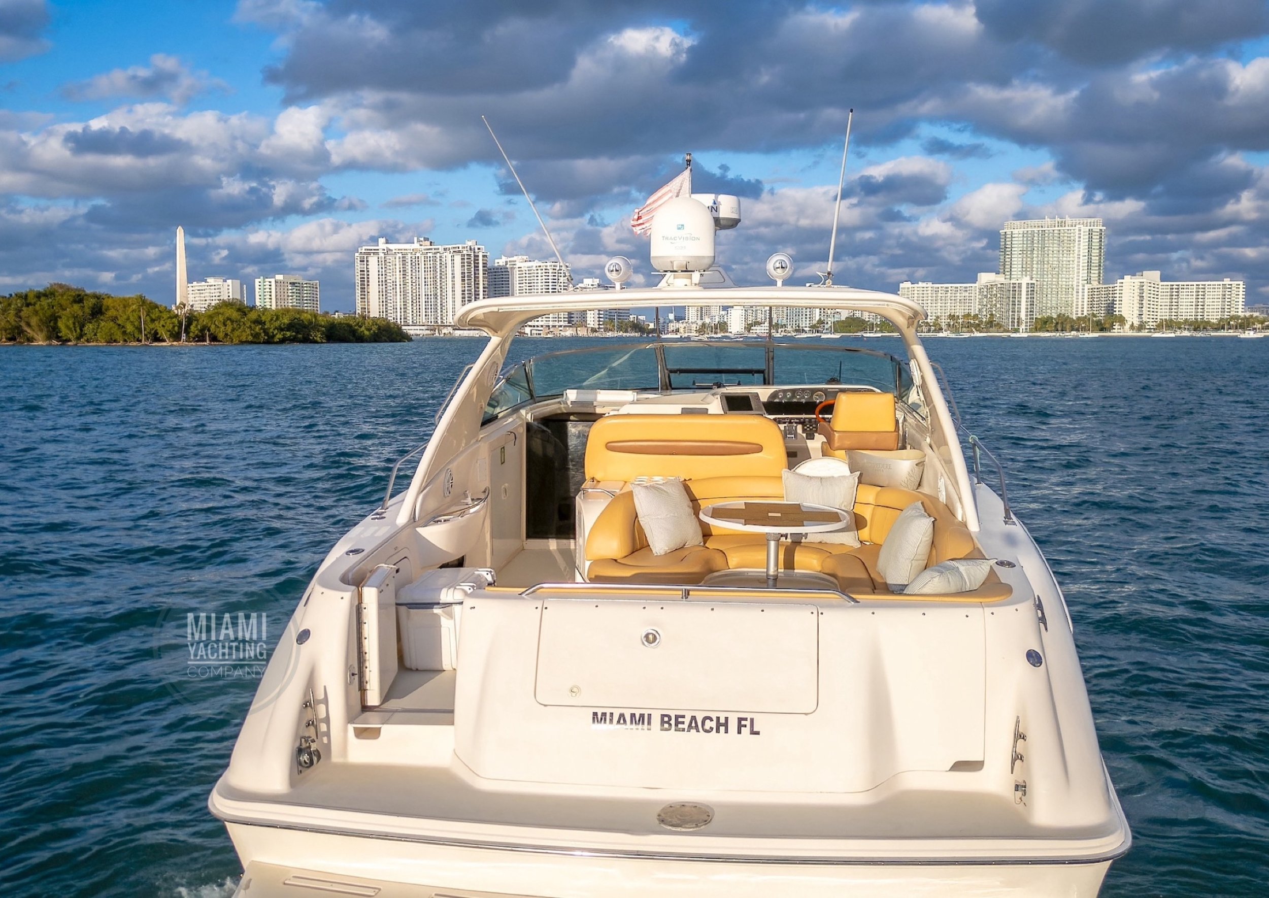 Departing from the heart of South Beach in Miami Beach, this yacht provides an ideal launch point for exploring Biscayne Bay, local sandbars, or cruising past the iconic Miami skyline. The spacious outdoor deck invites you to relax on sun pads or enjoy a shaded cocktail in the cockpit. The large swim platform makes dipping into the water easy, whether you're floating near Star Island or anchoring off Haulover.