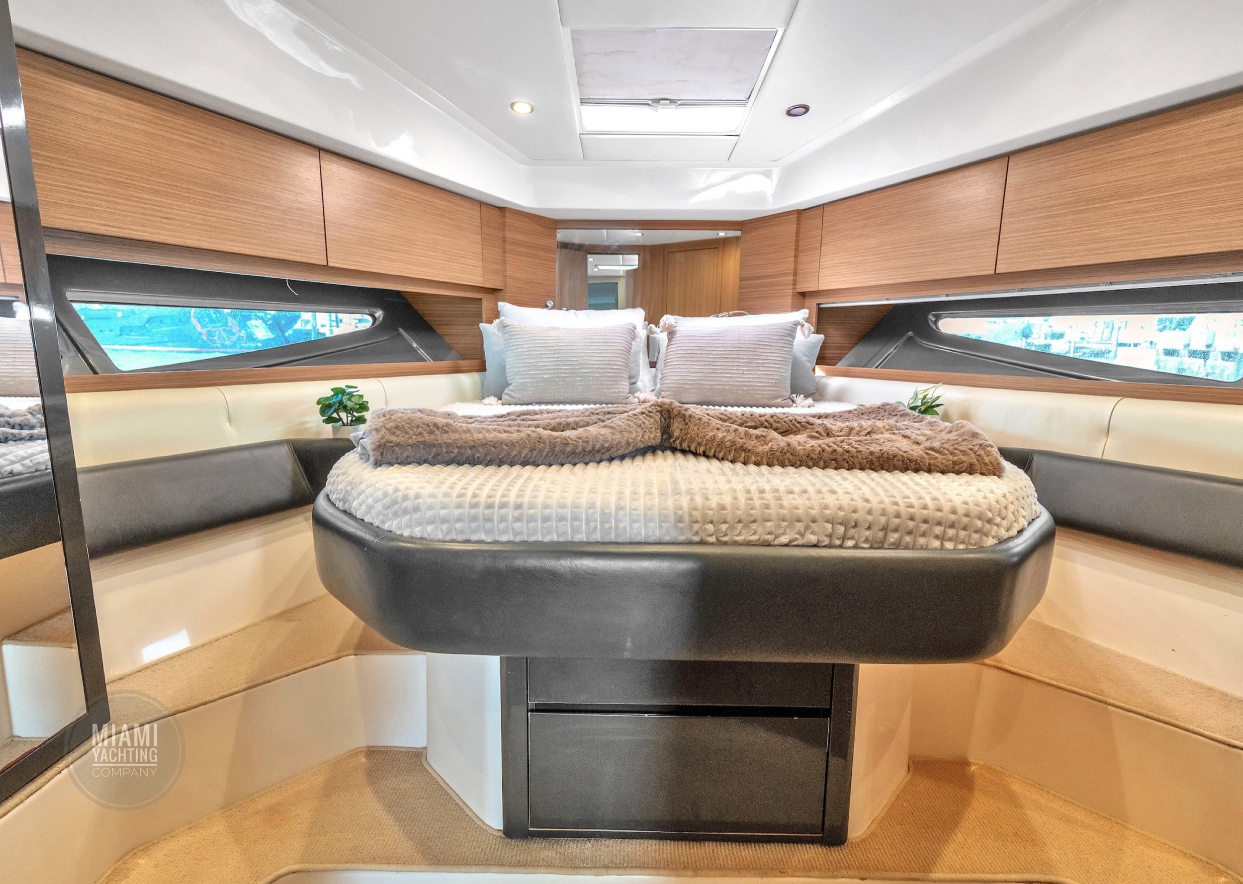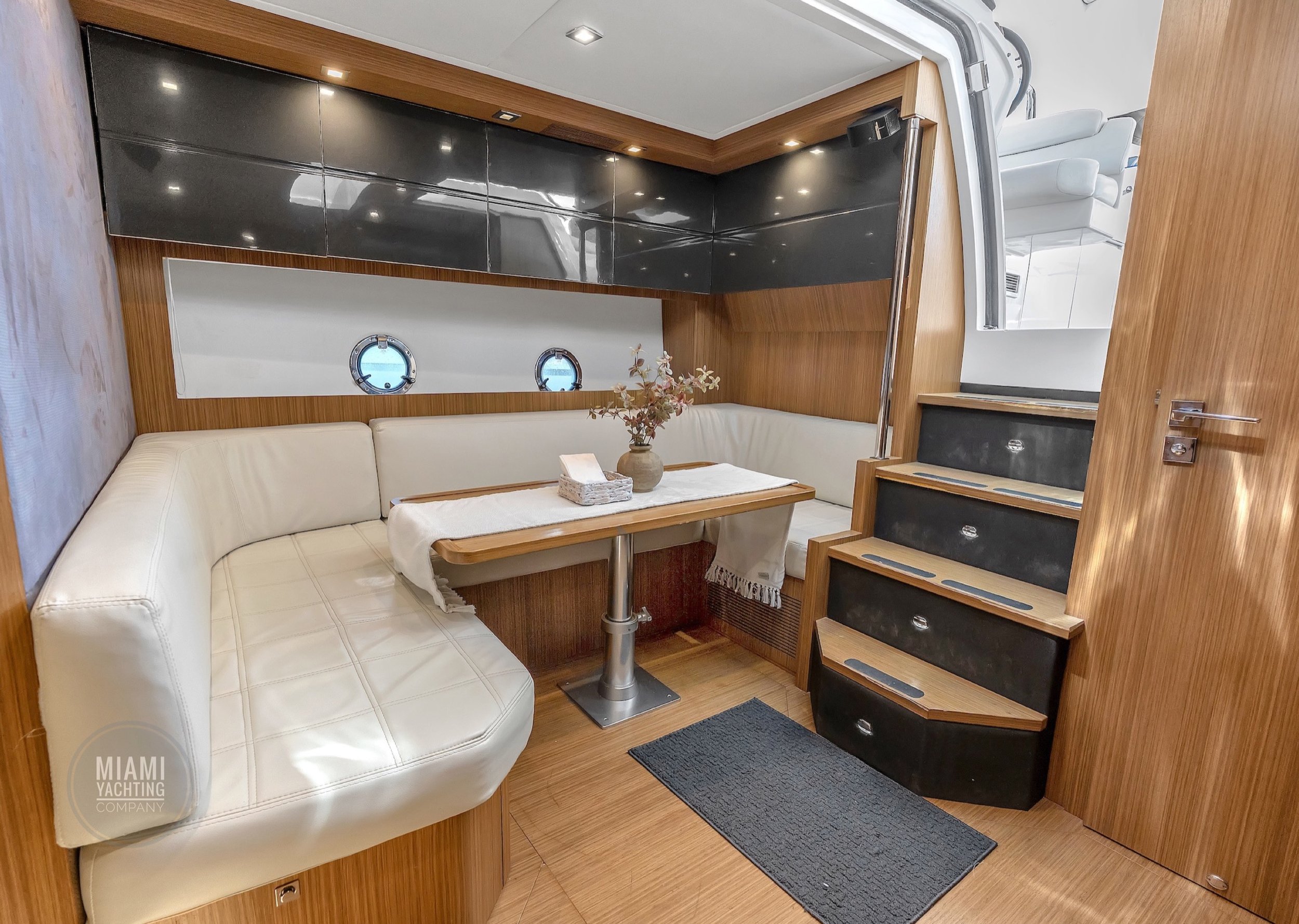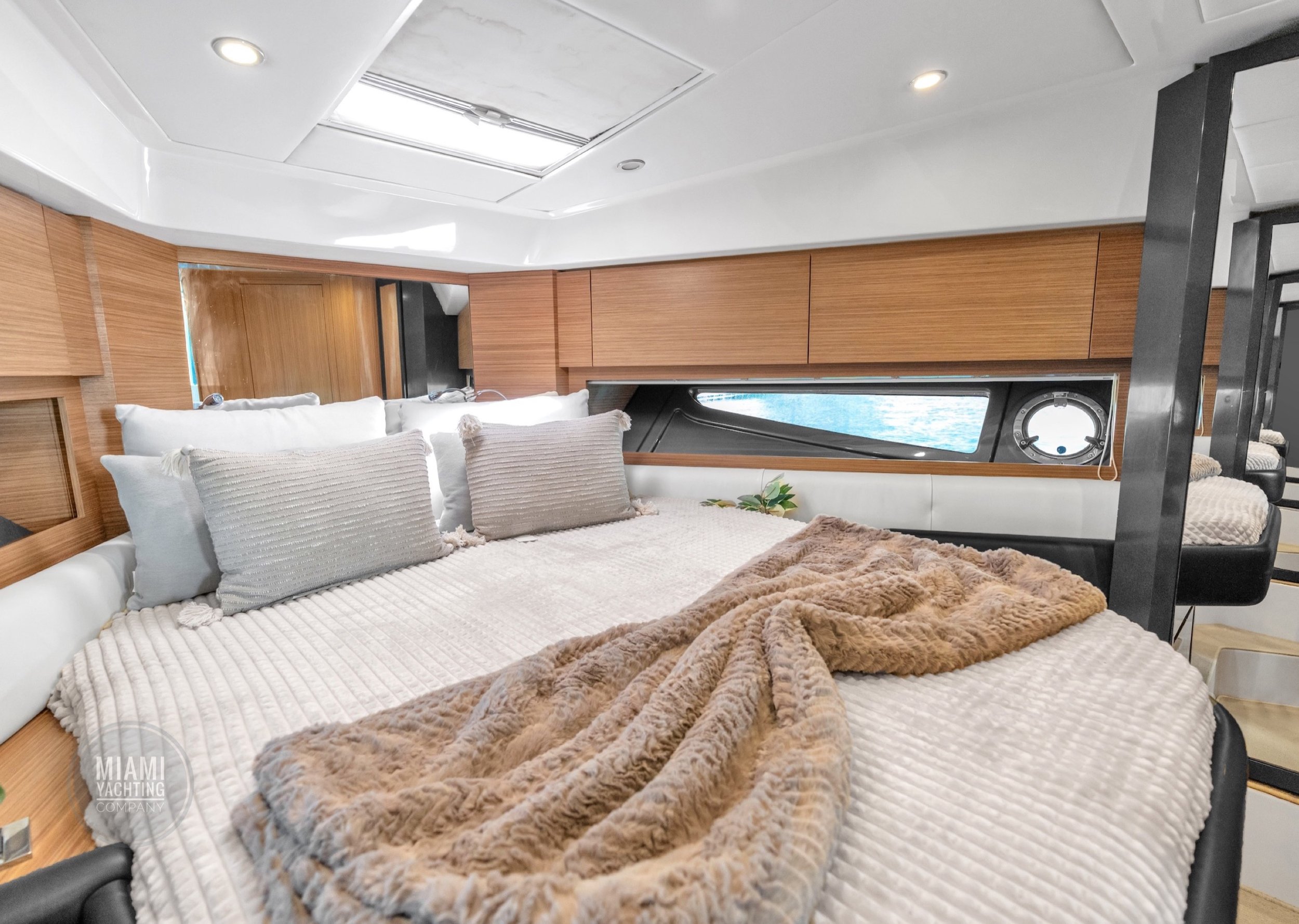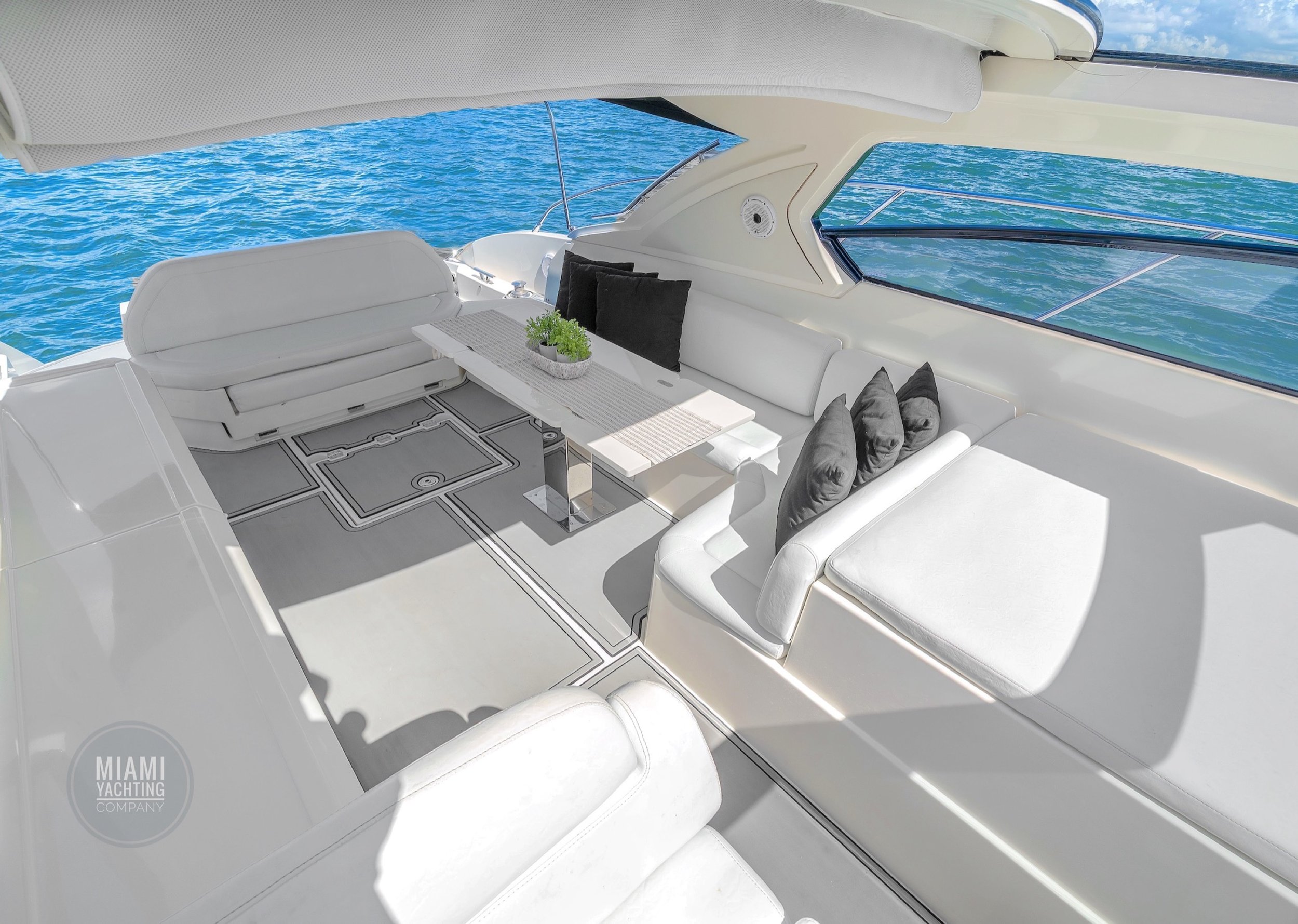 Ideal for a Miami day charter, the Atlantis features a spacious sunbed at the bow, a shaded cockpit lounge, and a hydraulic swim platform that makes water access effortless. The open main deck flows seamlessly into the interior salon, where wraparound windows flood the space with natural light and create an airy, refined atmosphere.
