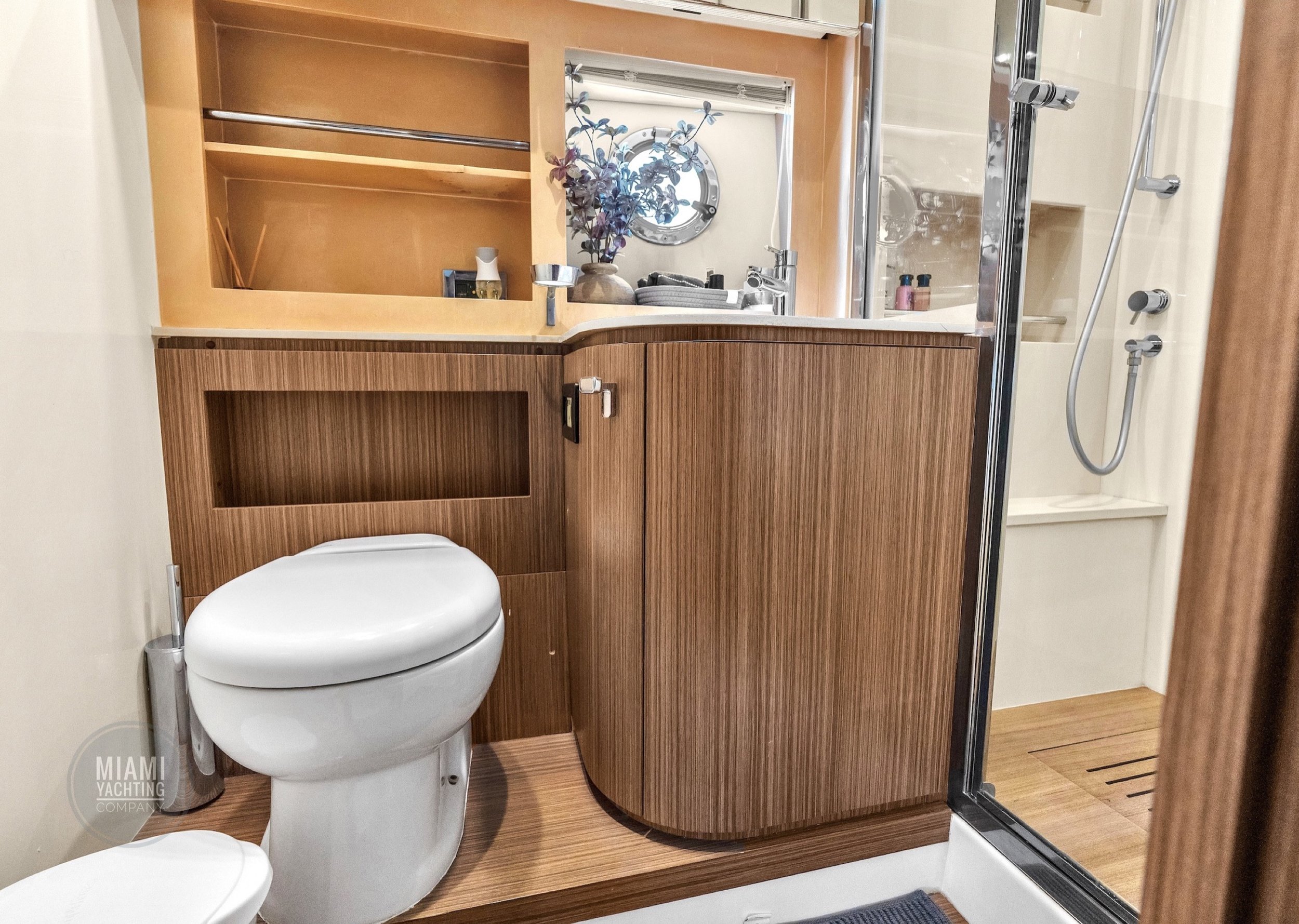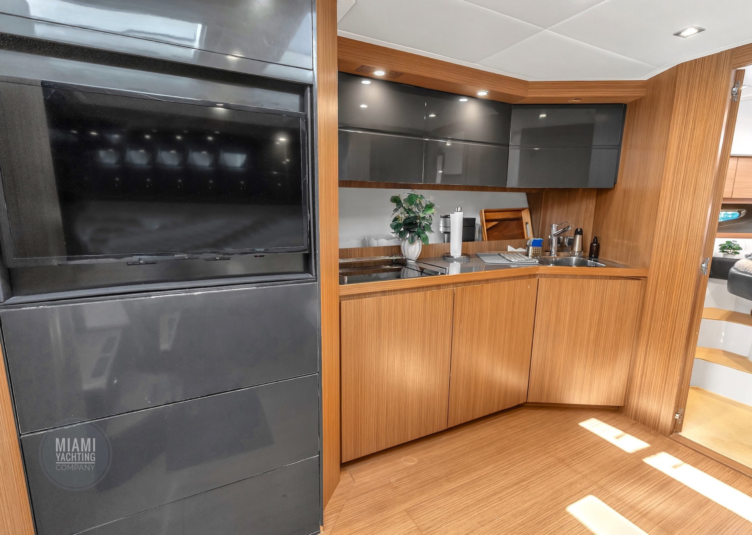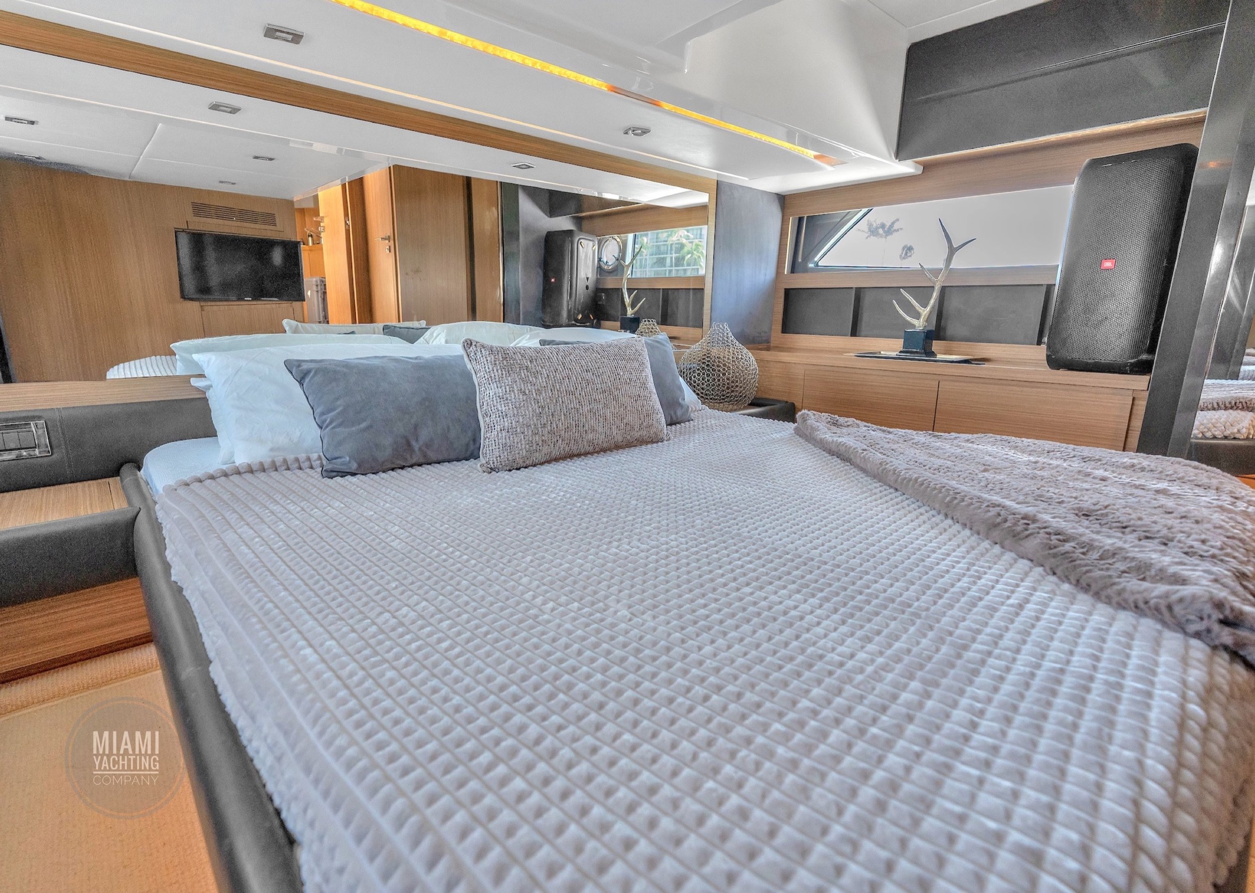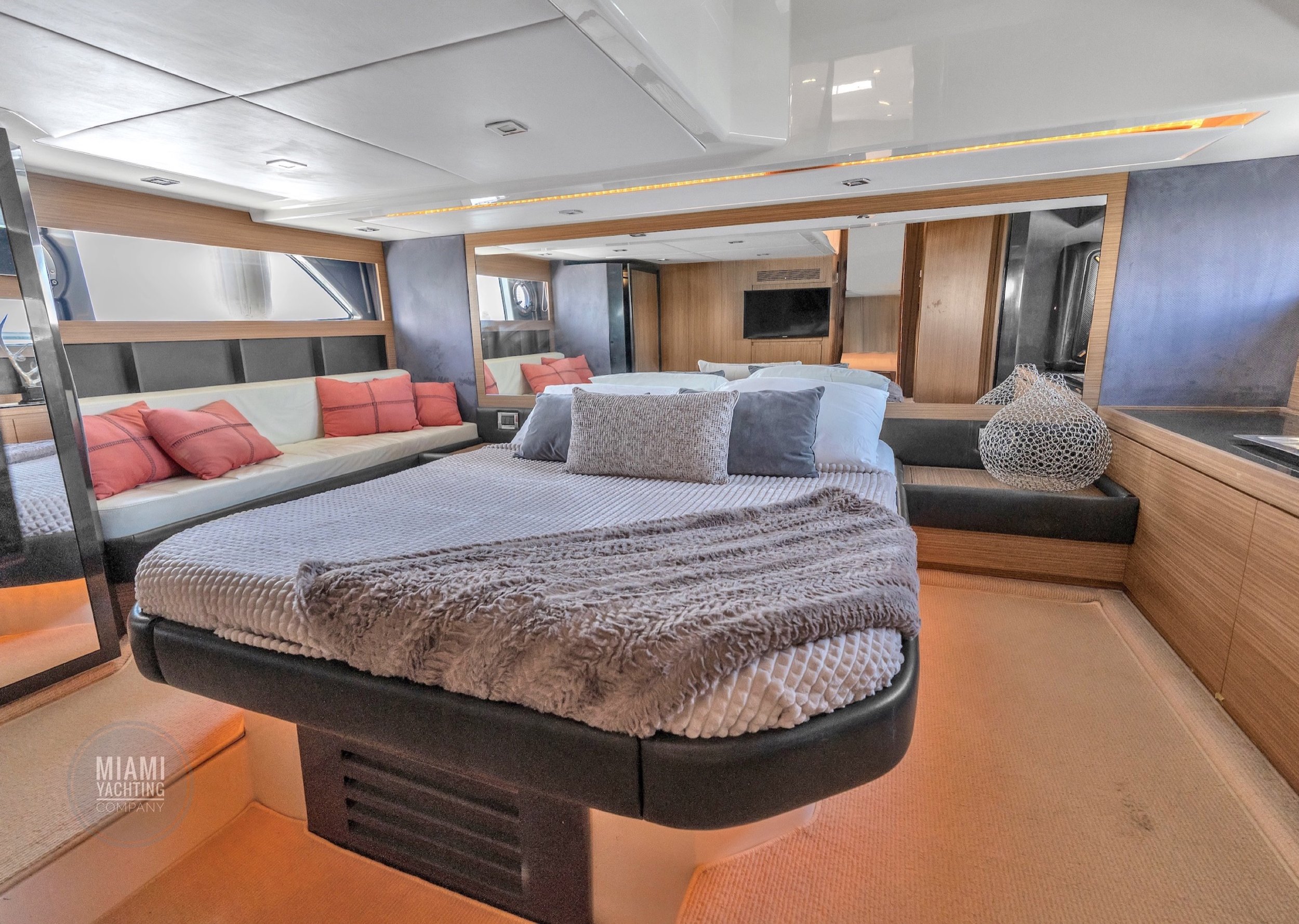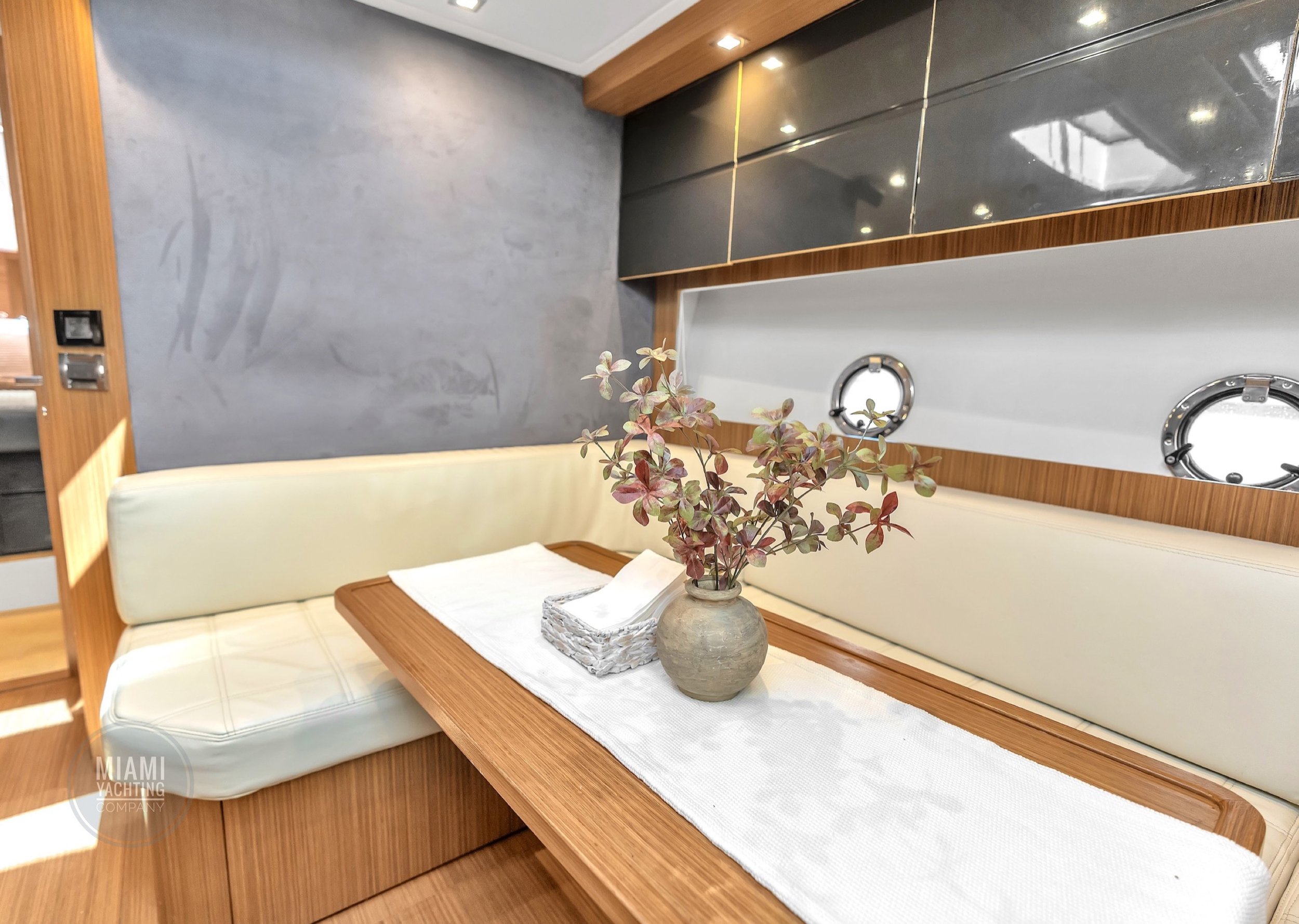 Ideal for a Miami day charter, the Atlantis features a spacious sunbed at the bow, a shaded cockpit lounge, and a hydraulic swim platform that makes water access effortless. The open main deck flows seamlessly into the interior salon, where wraparound windows flood the space with natural light and create an airy, refined atmosphere.