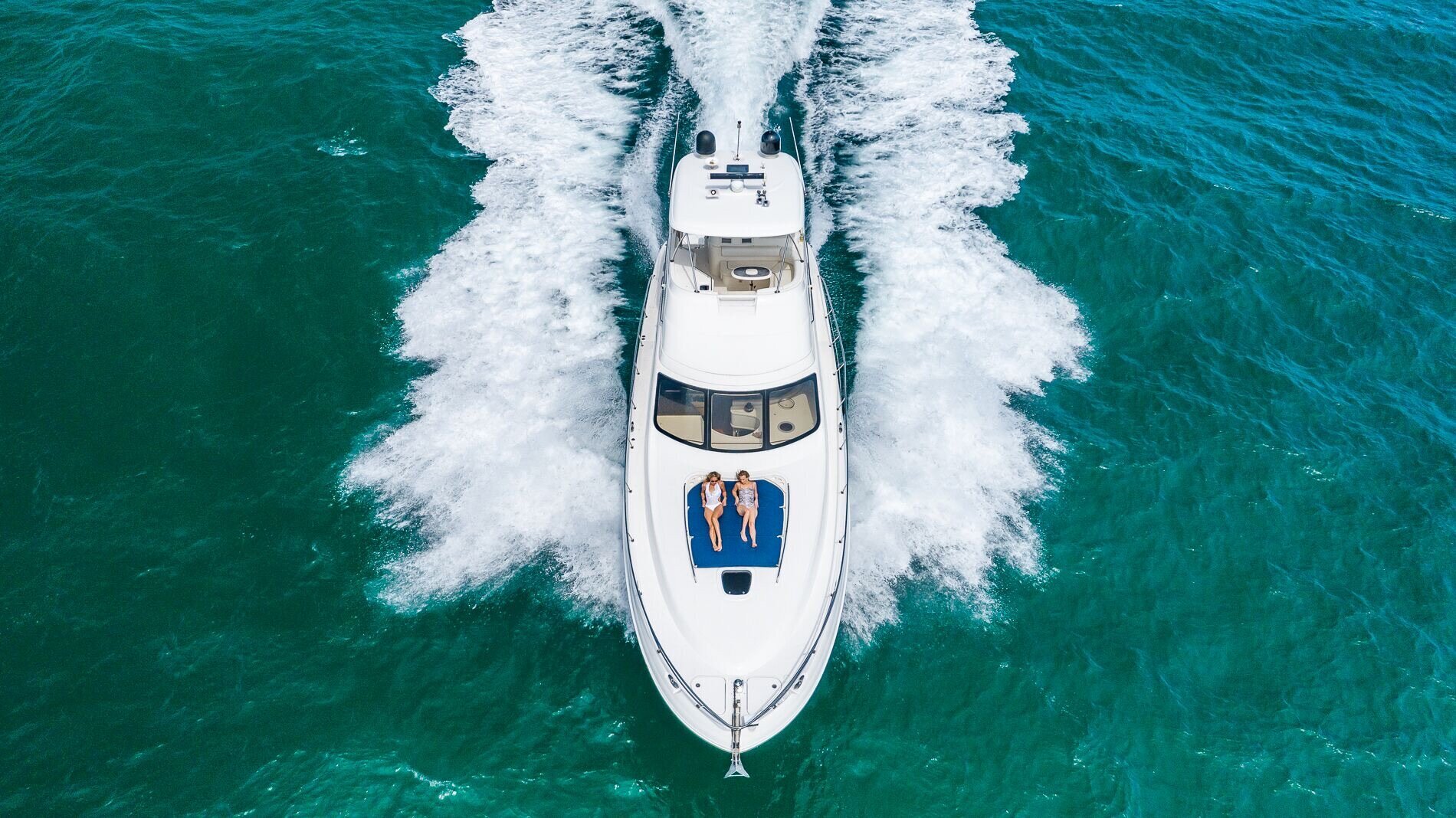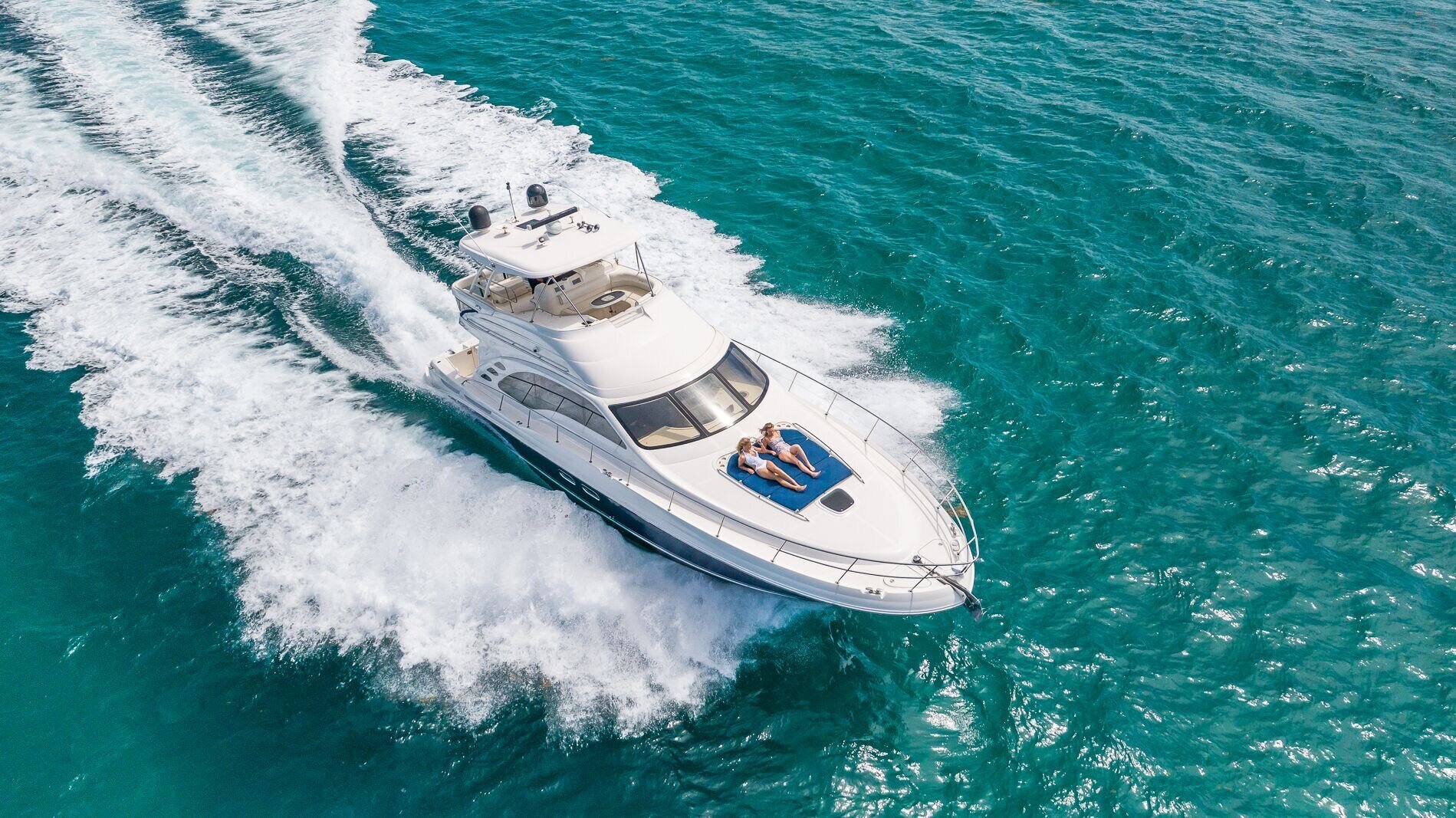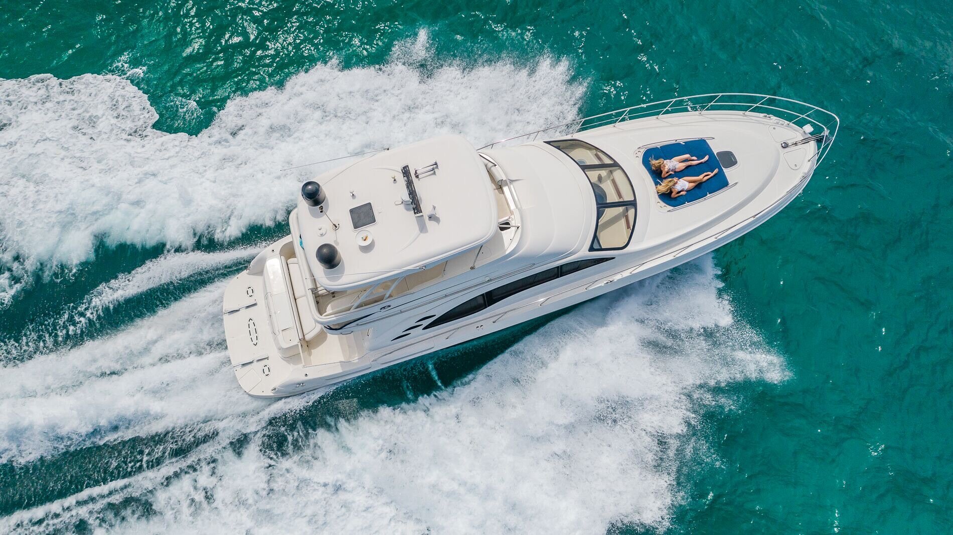 The 58’ Sea Ray Flybridge Motor Yacht is packed with luxury accommodation's that will make your time spent aboard a very memorable experience! enjoy the sights of Miami on its second level flybridge and sip your favorite beverage while cruising the tropical waters of south florida. If it get's too hot, enjoy the views from the air conditioned salon featuring large windows with 360 degrees views while lounging on the interior. The lower aft deck is great for dancing and toasting to the good life in Miami aboard this beautiful yacht. This yacht boasts a powerful sound system and a large floating foam island to lounge on while at anchor.