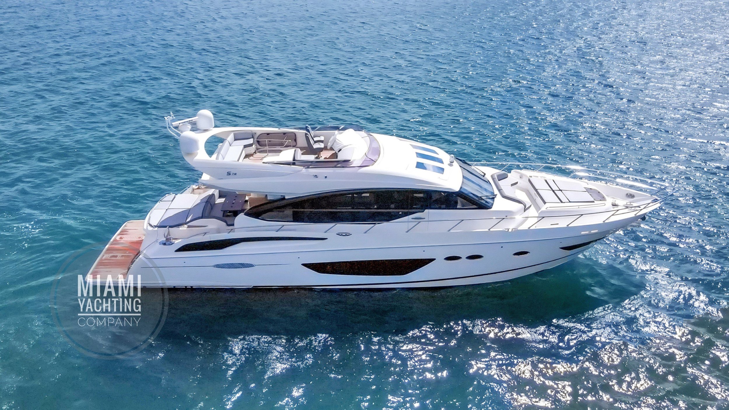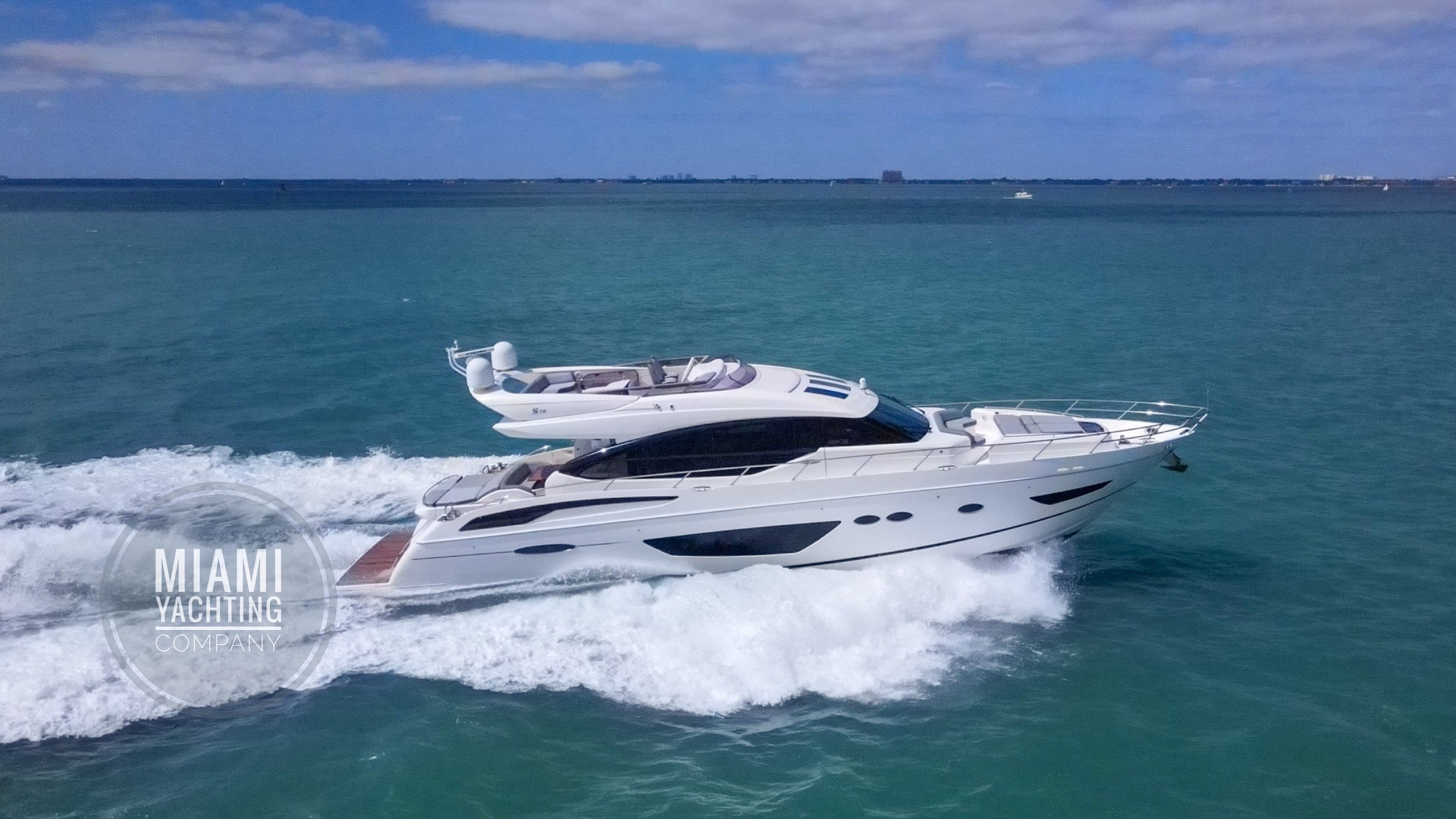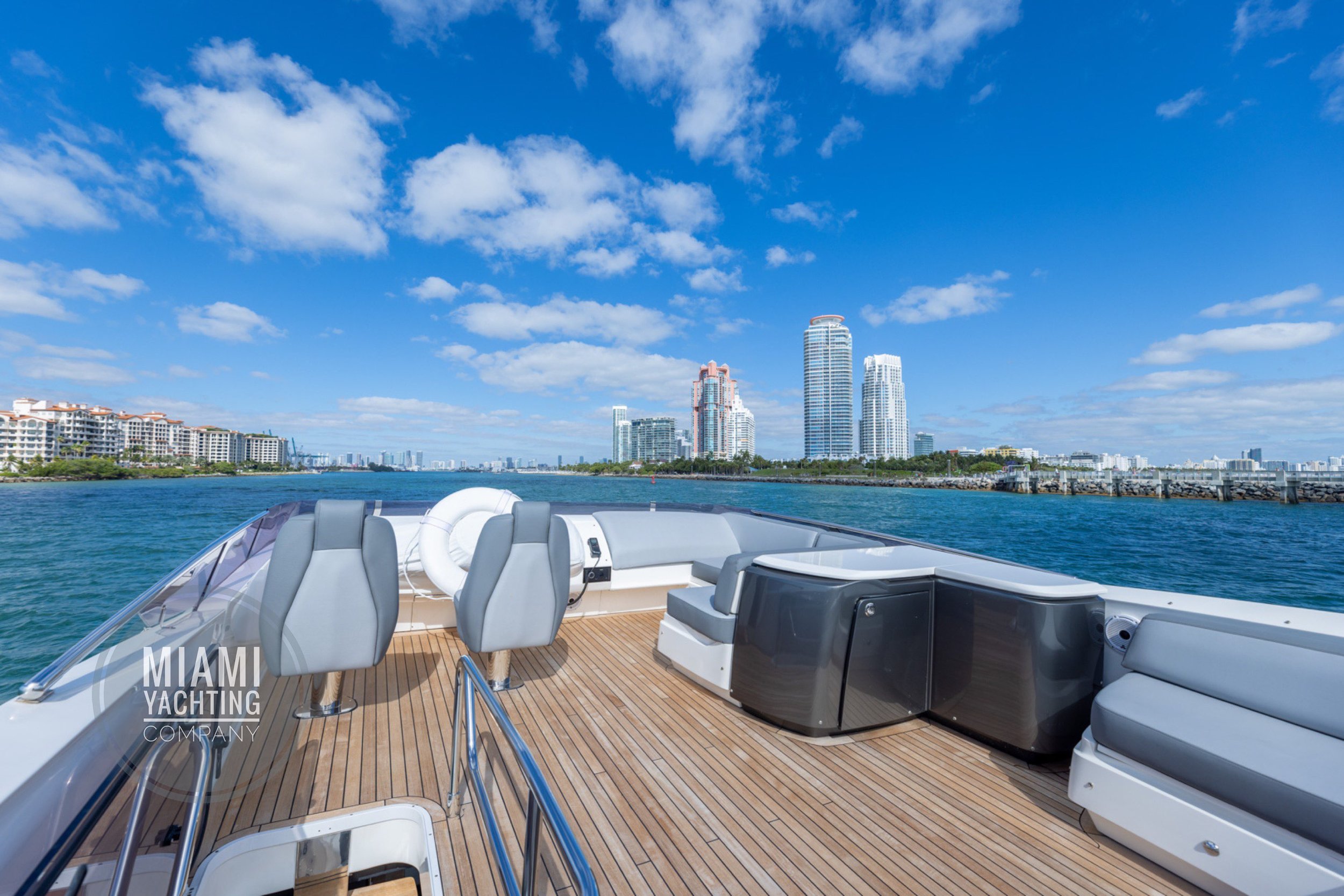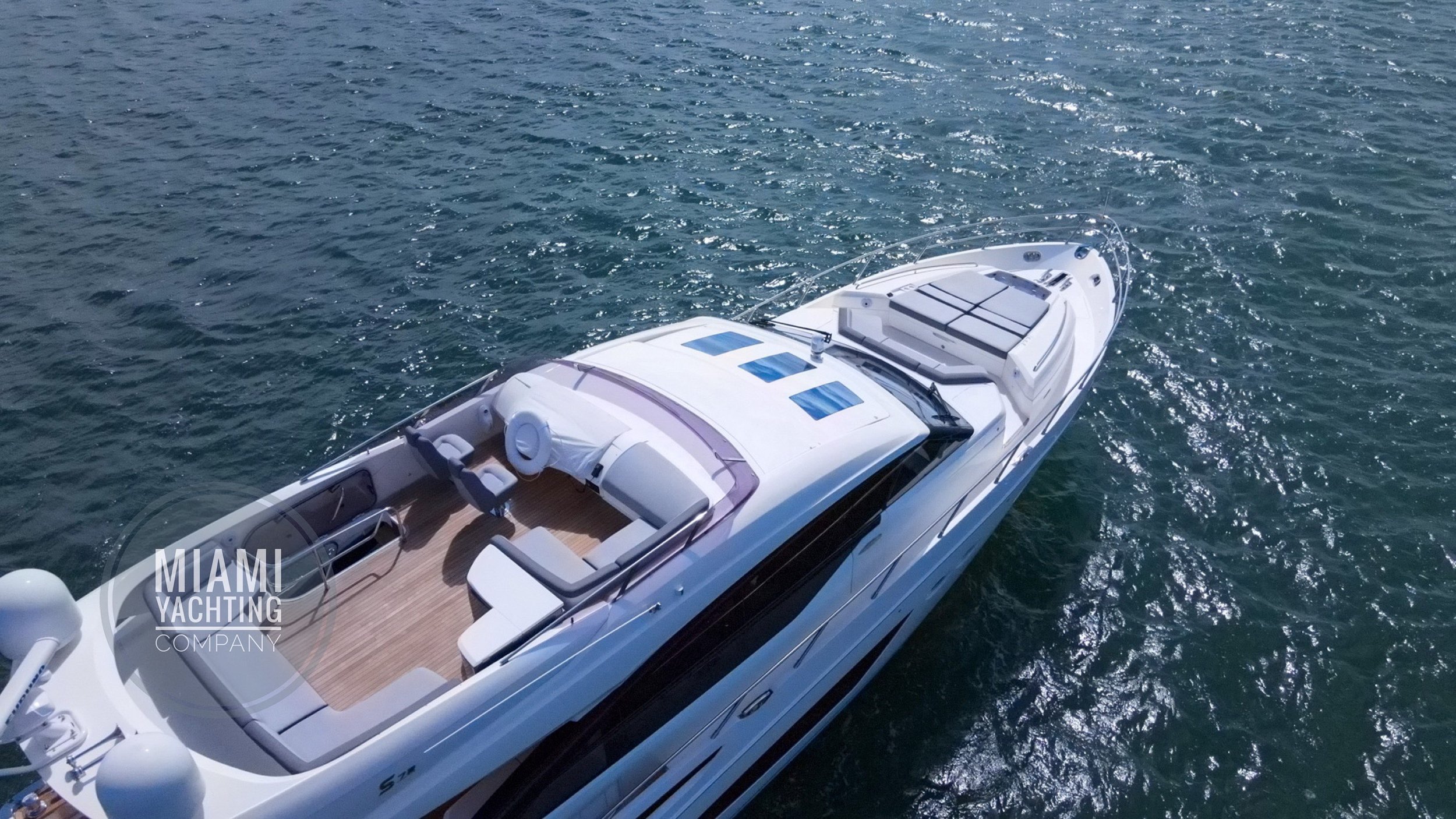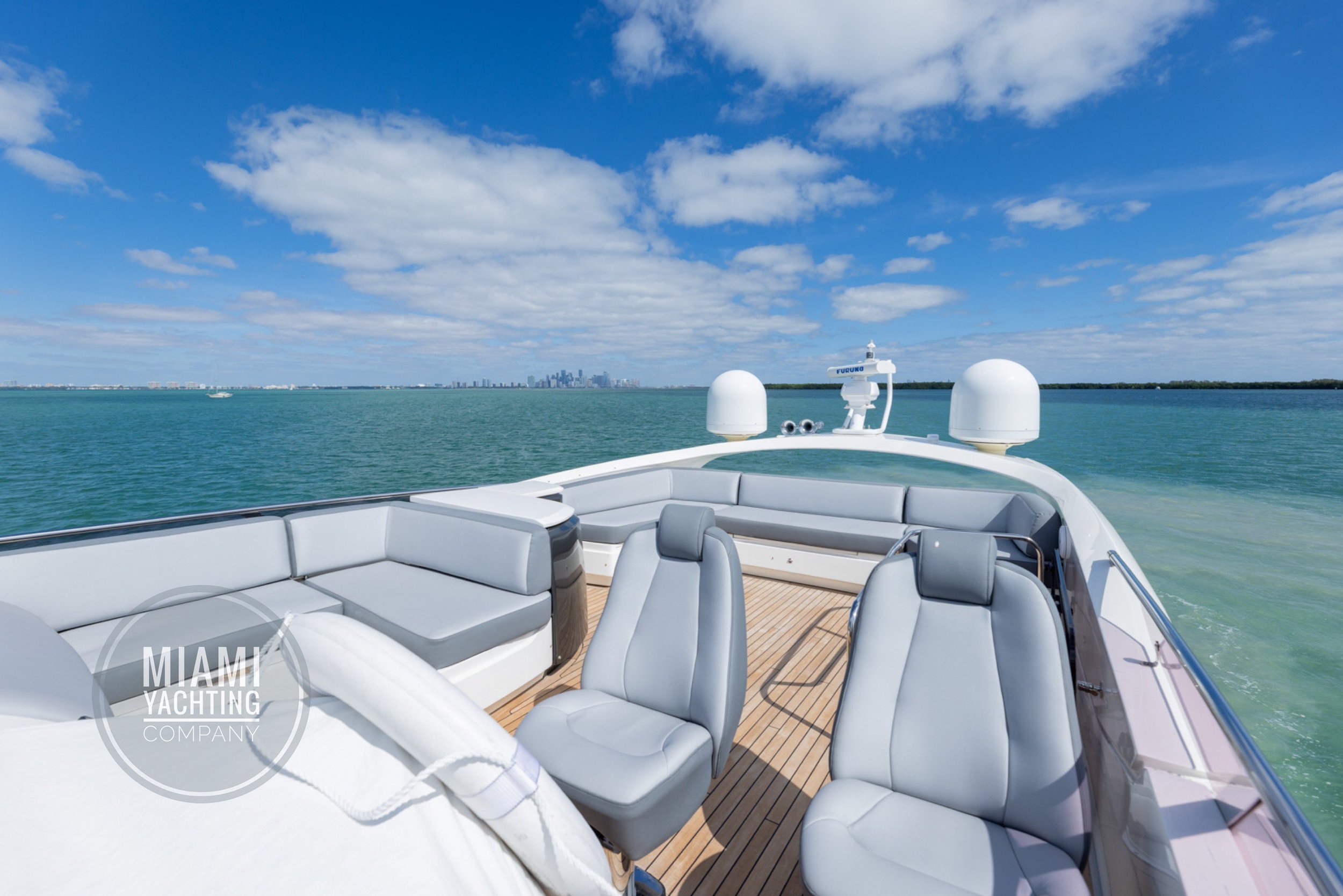 Recognized for their excellence in the yachting industry worldwide, Princess yachts provide an unparalleled combination of comfort, quality and flexibility. With 74 ft of length overall, this gorgeous s72 Princess Miami yacht rental has no shortage of perfect places to entertain, or to sit back, relax, and enjoy the yacht’s exhilarating performance. The cockpit bar connects to the galley to create an almost seamless transition from outside to in, with a glass window partition which folds up from the unit below to provide serving access when entertaining. The salon is designed for sociable living, with a large L-shaped dining area opposite the fully equipped galley, leading to a cavernous main deck saloon with U-shaped sofa. Below deck, eight guests can enjoy four beautifully appointed cabins, three of which are en-suite, all bathed in natural light from elegant hull glazing, with a further twin cabin with en-suite aft for occasional guests or crew. A dedicated staircase leads from the main deck to the full-beam owner’s stateroom amidships, via a private lobby area in the lower. Reserve this gorgeous yacht for rent in Miami with family or friends. She is perfect for exploring South Beach, Key Biscayne and the surrounding waterways of South Florida on your next miami boat rental adventure.